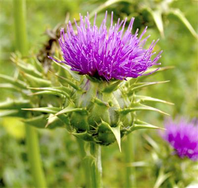 У растения молочный чертополох колючие листья и красновато-фиолетовые цветы . Его иногда называют силимарин или дикий артишок . Полагают, что оно оказывает защитное действие на печень и в настоящее время используется . . .