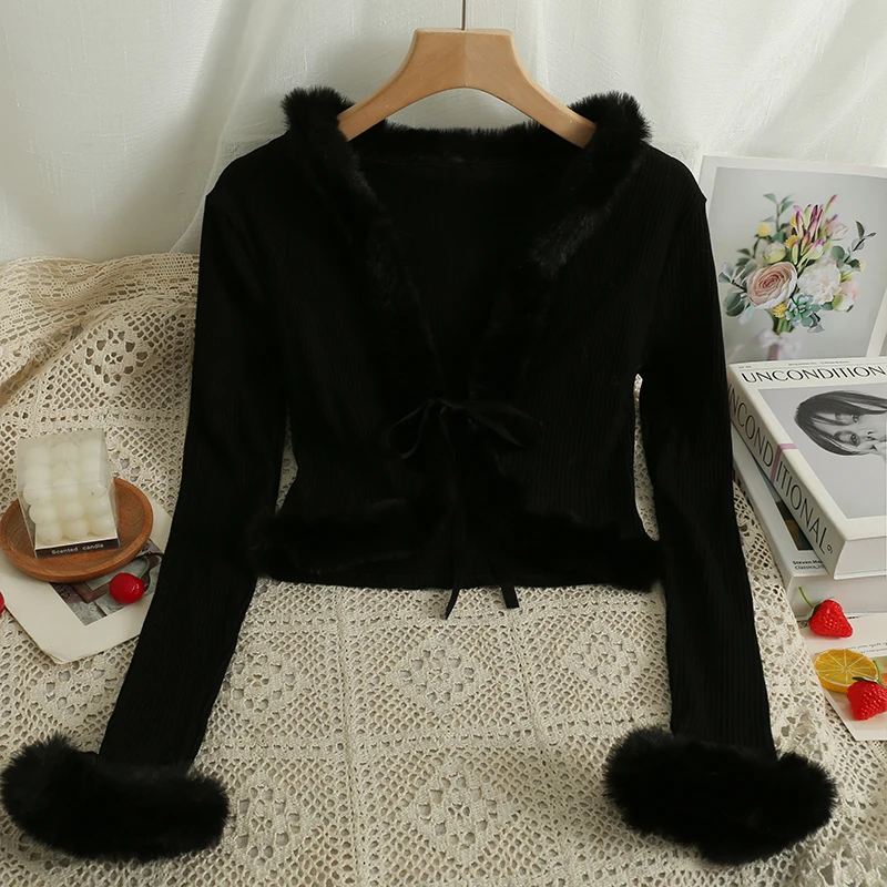 Купить Rin Confa Autumn Winter Fashion V-Neck long sleeve knitted Cardigan fluffy patchwork high waist lace up short solid Sweater To за 700рублей
