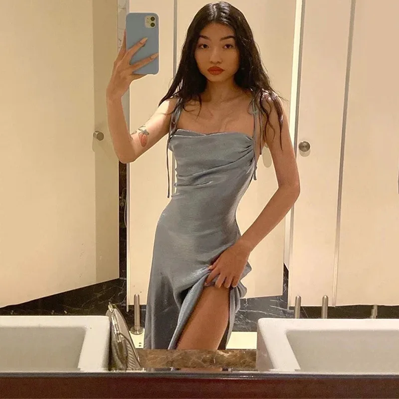 Купить SKMY Fashion Sexy Spaghetti Strap Swinging Collar Irregular Midi Dress 2022 Spring New Backless High Waist Slim Party Dress за 850рублей