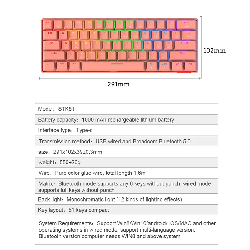 Купить STK61 Rainbow Backlit Keyboard BT 3.0 +Type-C Dual-Mode Mechanical Gaming Keyboard for IOS Android Win Mobil Tablets Notebook за 4000рублей