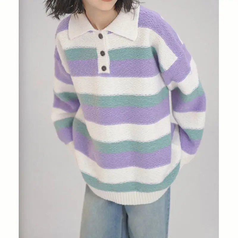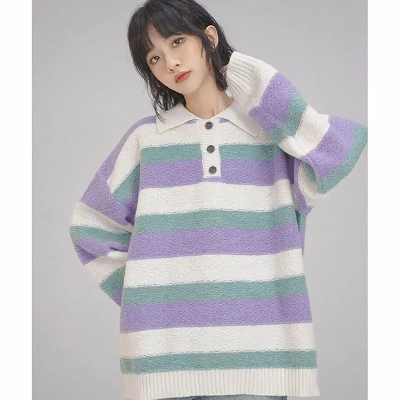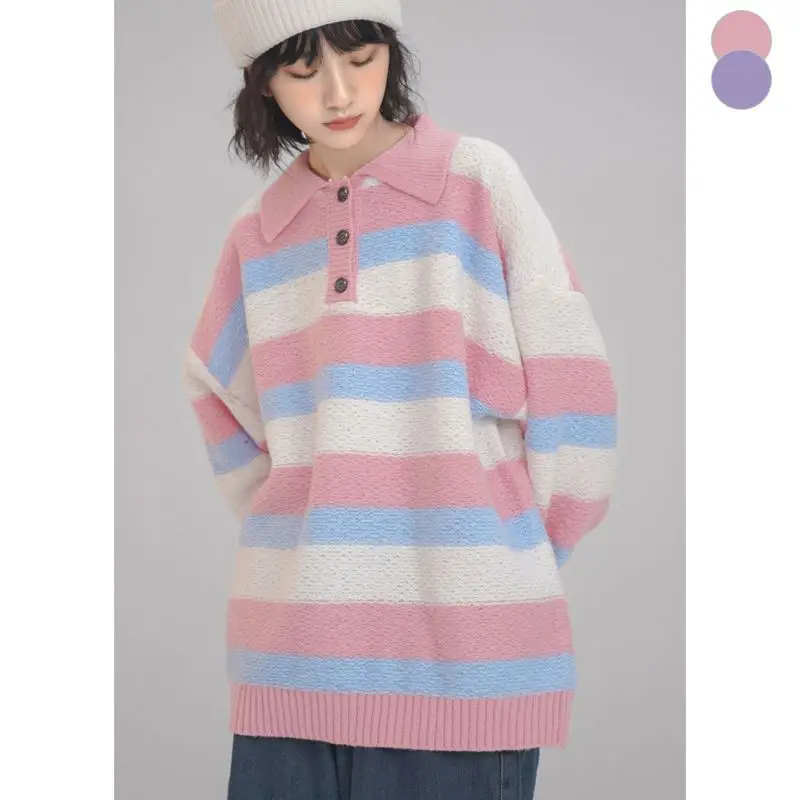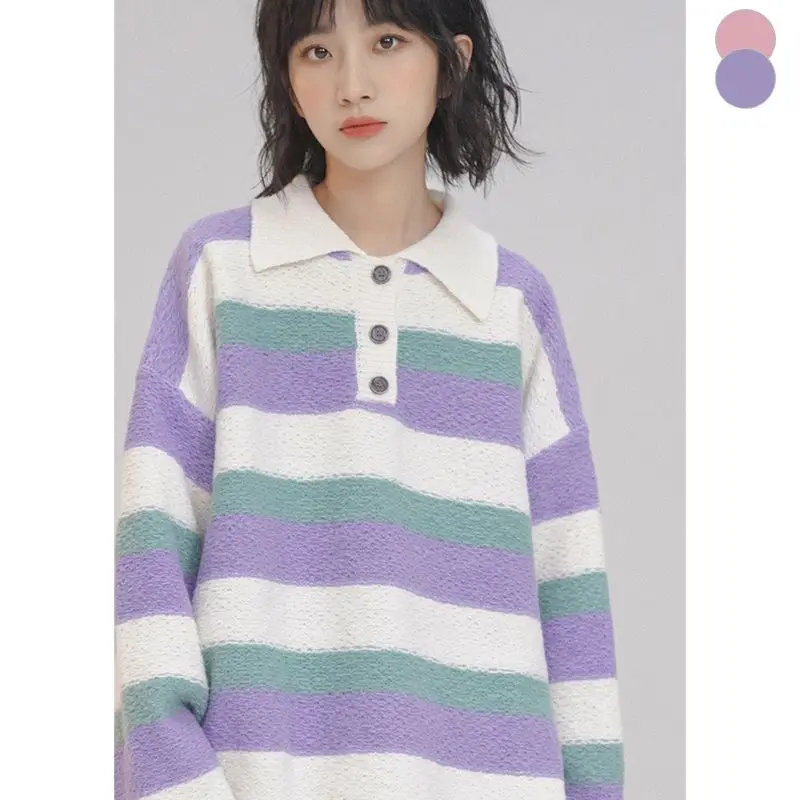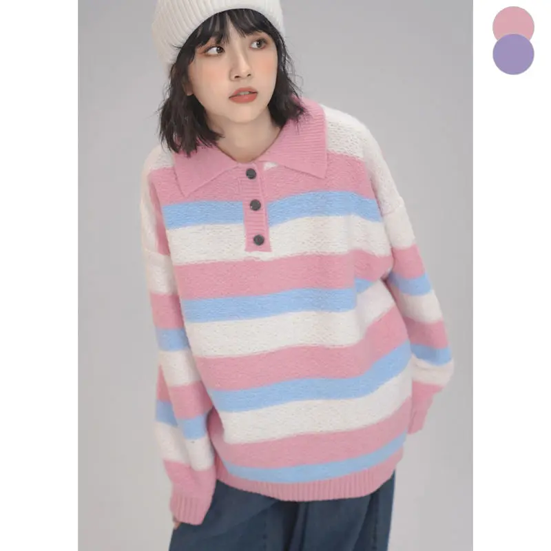 Купить STSVZORR Japanese Soft Waxy Stripe Sweater Women's Autumn and Winter New Sweet Loose Lazy Style Versatile Outwear Knitwear за 1800рублей