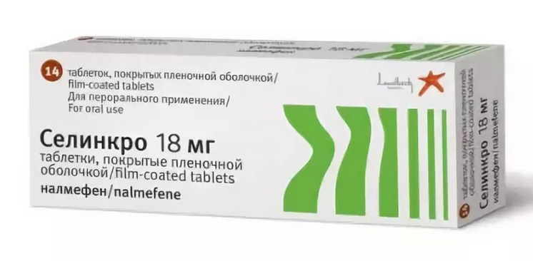 СЕЛИНКРО таблетки, покрытые пленочной оболочкой, по 18 мг № 7 (7х1) в блистерах . СЕЛИНКРО таблетки, покрытые пленочной оболочкой, по 18 мг № 14 (14х1) в блистерах . Лундбек Экспорт А / С . Состав . действующее вещество: налмефен;