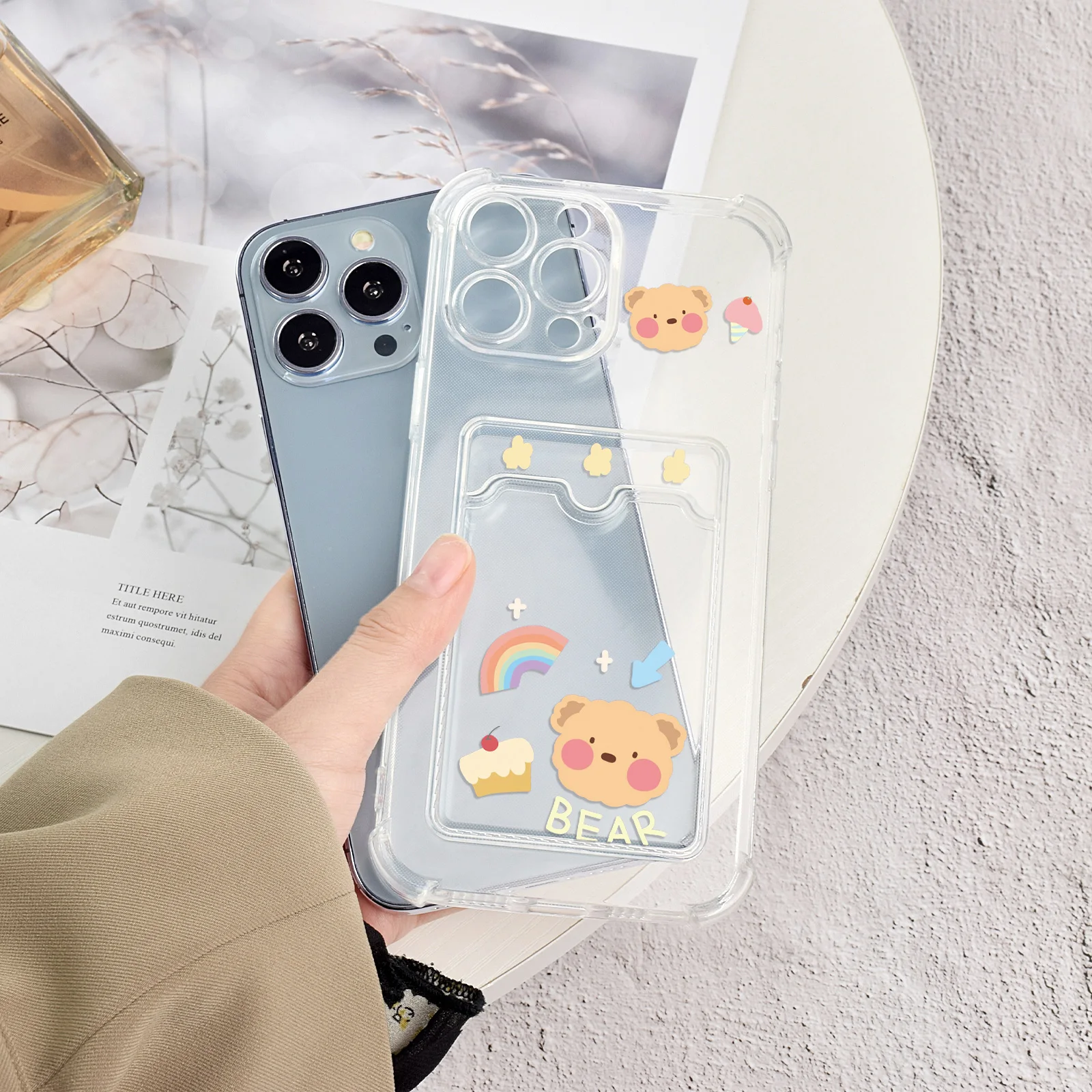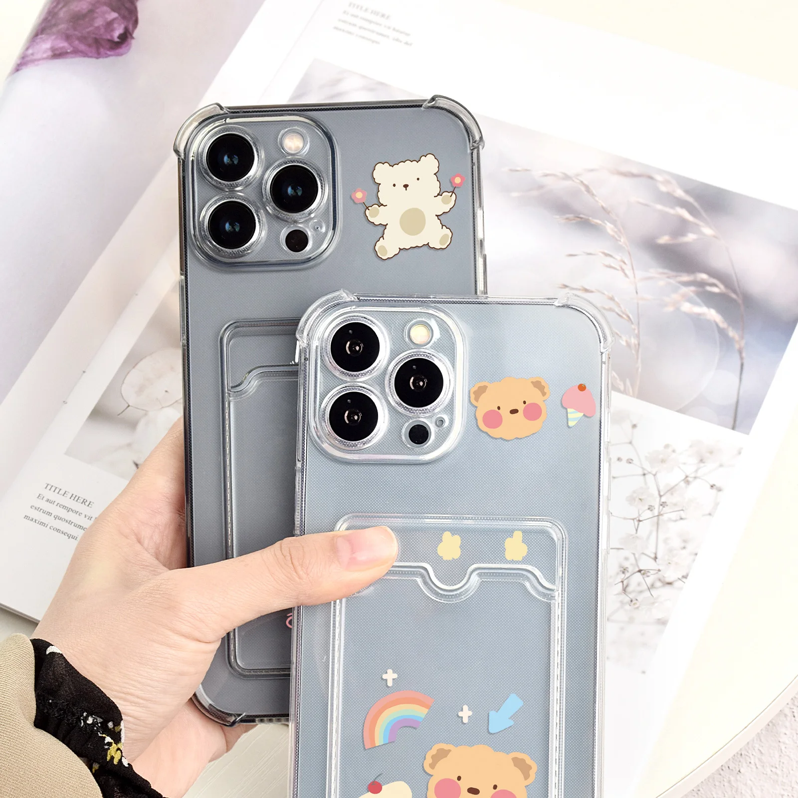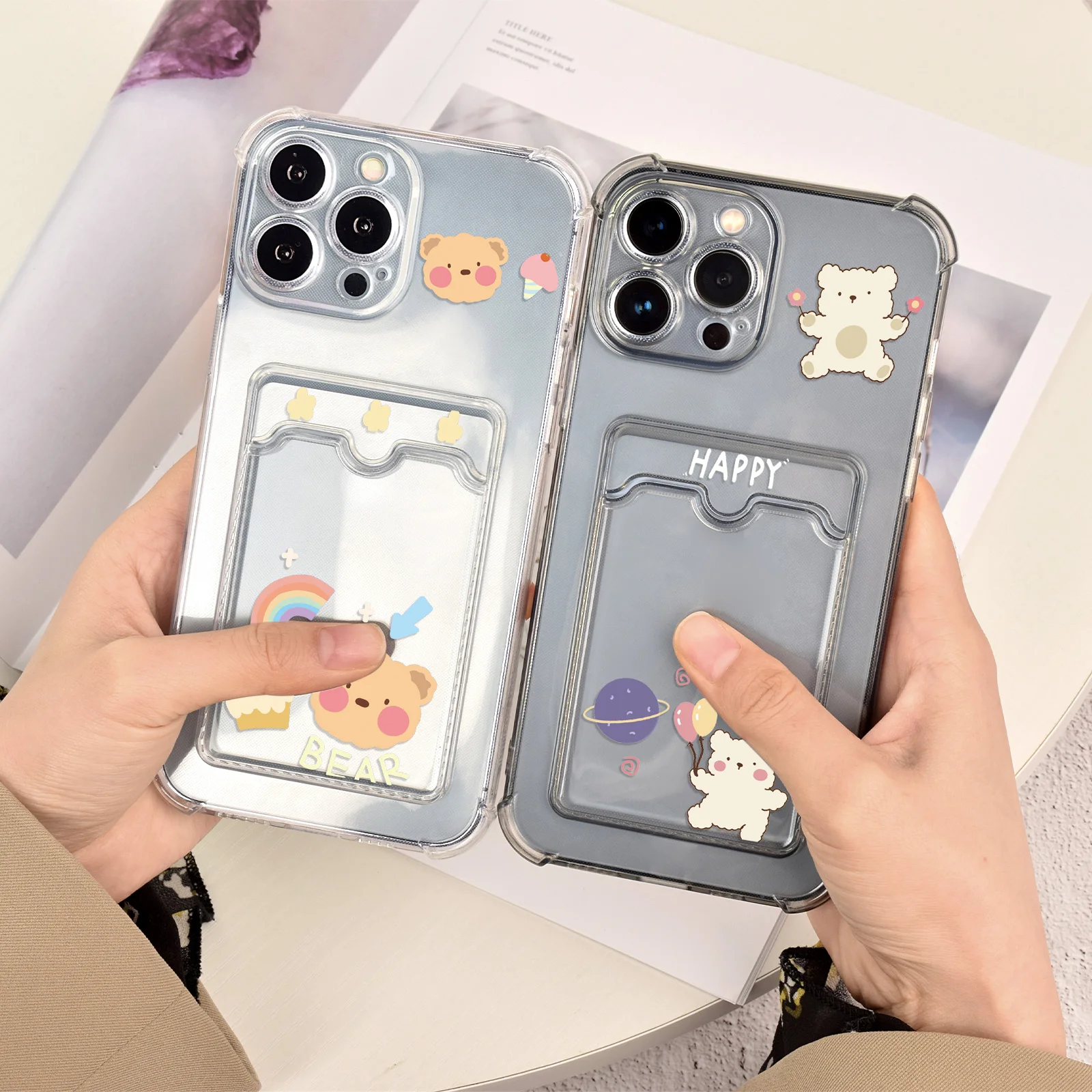 Купить Shockproof Transparent Card Bag Phone Case for iPhone 14 Plus 13 11 12 Pro Max Mini XR XSMax XS X Cartoon Cute Bear Cover за 200рублей