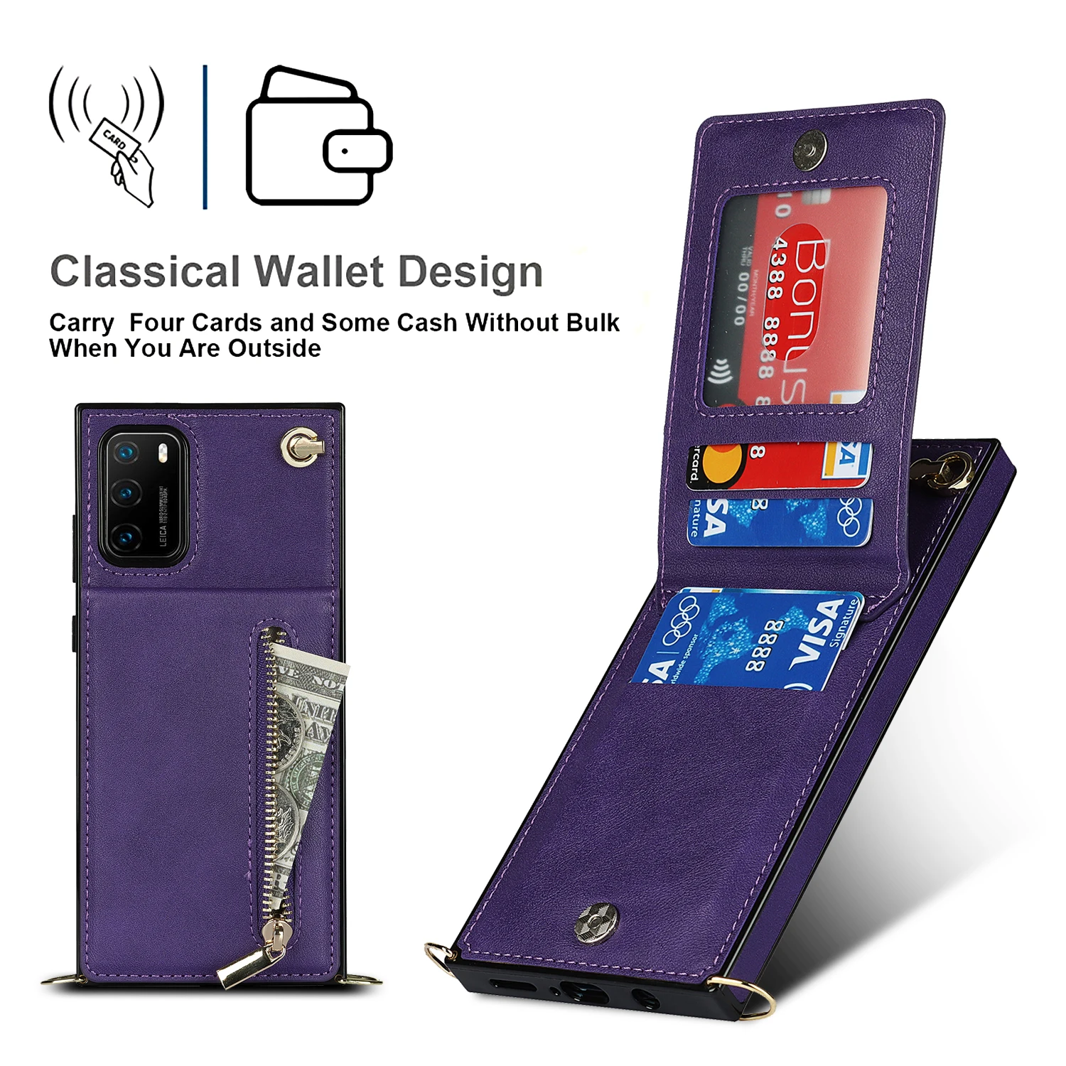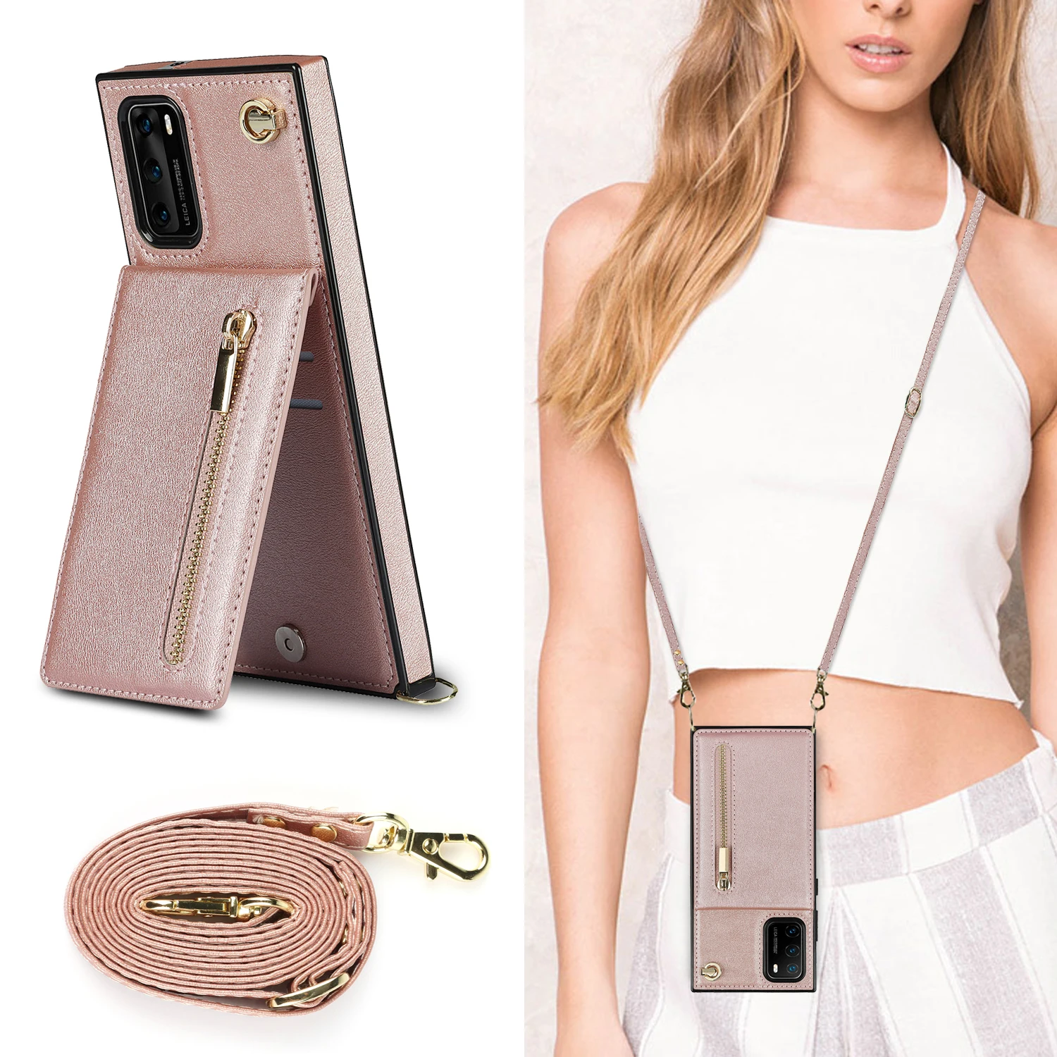 Купить Shoulder Strap Zipper Wallet Phone Case For Huawei P30 P40 Plus Mate 20 Lite Mate 30 40 Pro With Card Holder Anti-drop Cover за 300рублей