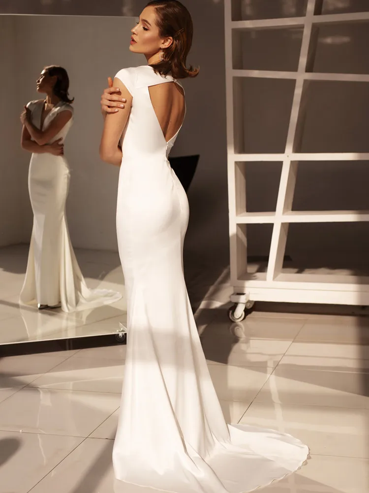 Купить Simple Beach Mermaid Wedding Dresses Deep V-Neck Sexy Backless Stain Sleeveless Sweep Train Bride Gown Custom Made Style Elegant за 4650рублей
