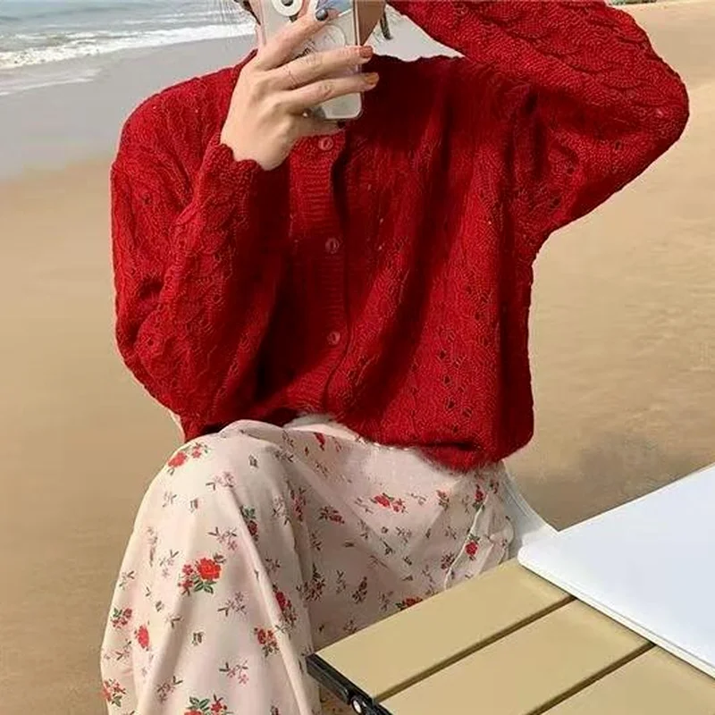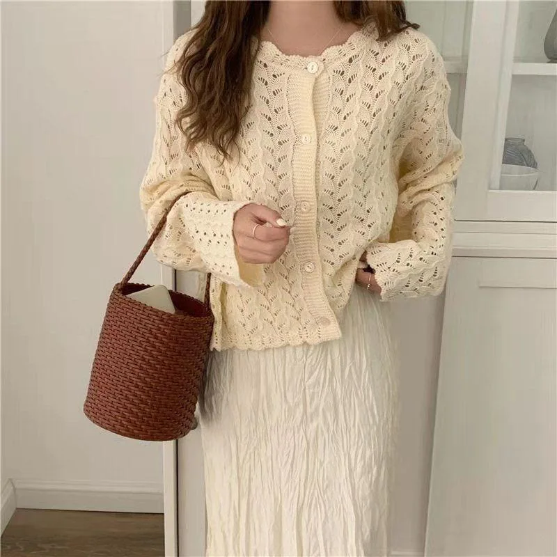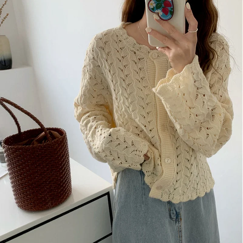 Купить Simple Loose Casual Cardigans Women Solid Hollow Out Knitted Sweater Korean Style All-match Retro Fashion Sweet Elegant Sweaters за 550рублей