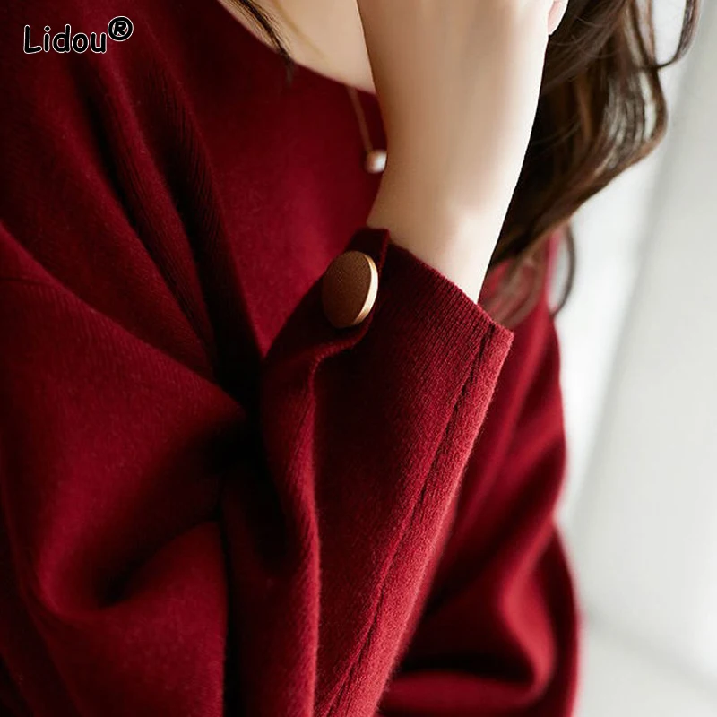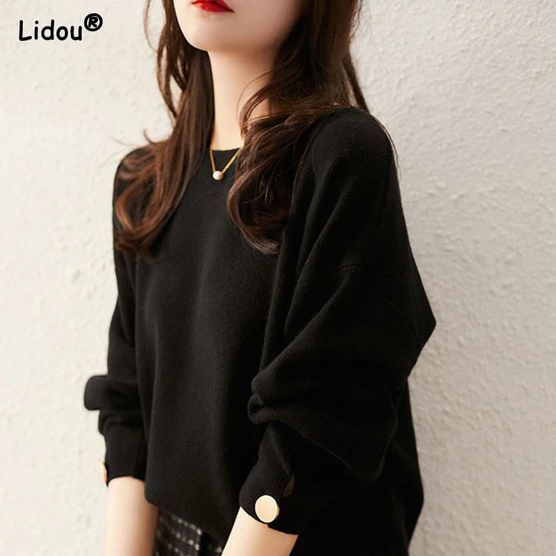 Купить Solid Sweaters Loose Autumn Winter Thick Pullovers Straight Round Neck 2022 Women's Clothing Button Knitted Temperament Elegant за 900рублей