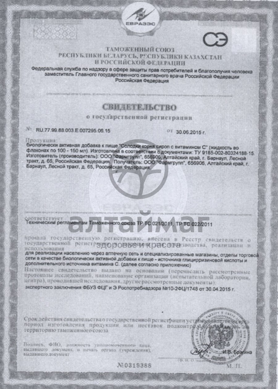 Сироп корня солодки с витамином С, 100 мл . Рекомендуется в качестве биологической активной добавки к пище — источника глицирризиновой кислоты и дополнительного источника витамина С .
