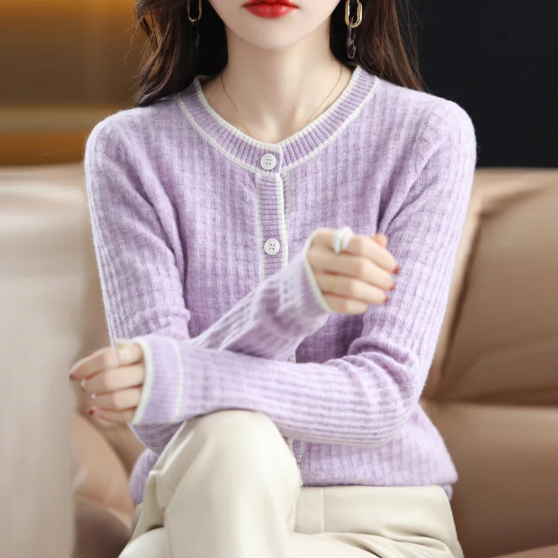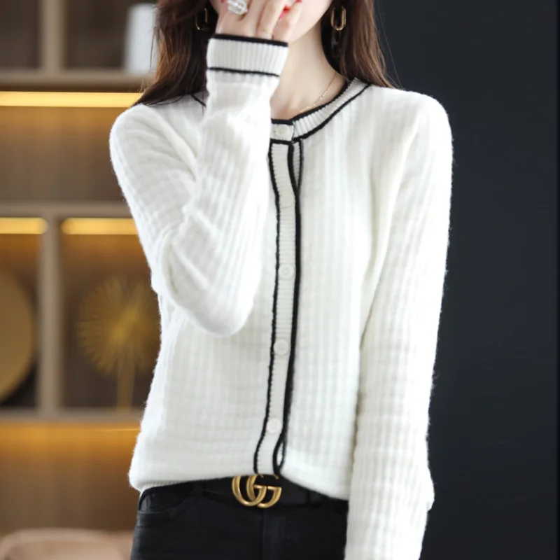 Купить Spring And Autumn New 100% Pure Wool Cardigan Knitted Sweater Women's Round Neck Loose All-Match Western Style Jacket Top Women за 2500рублей