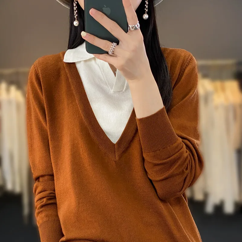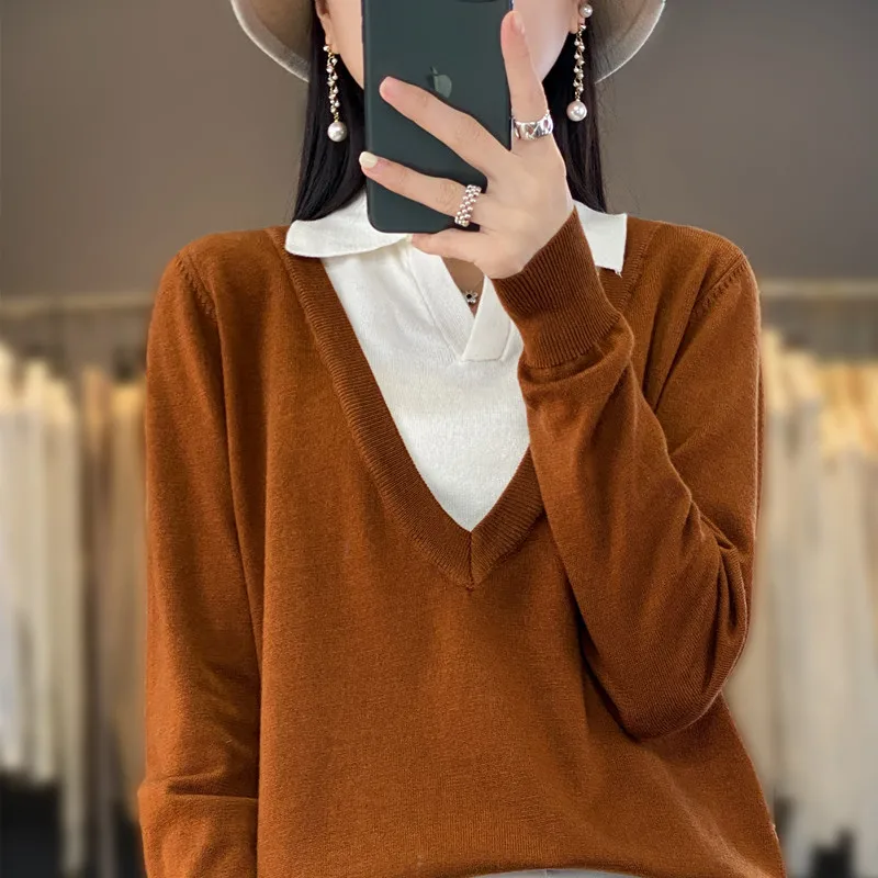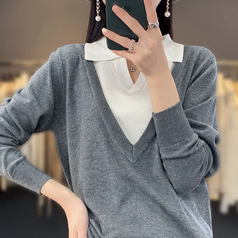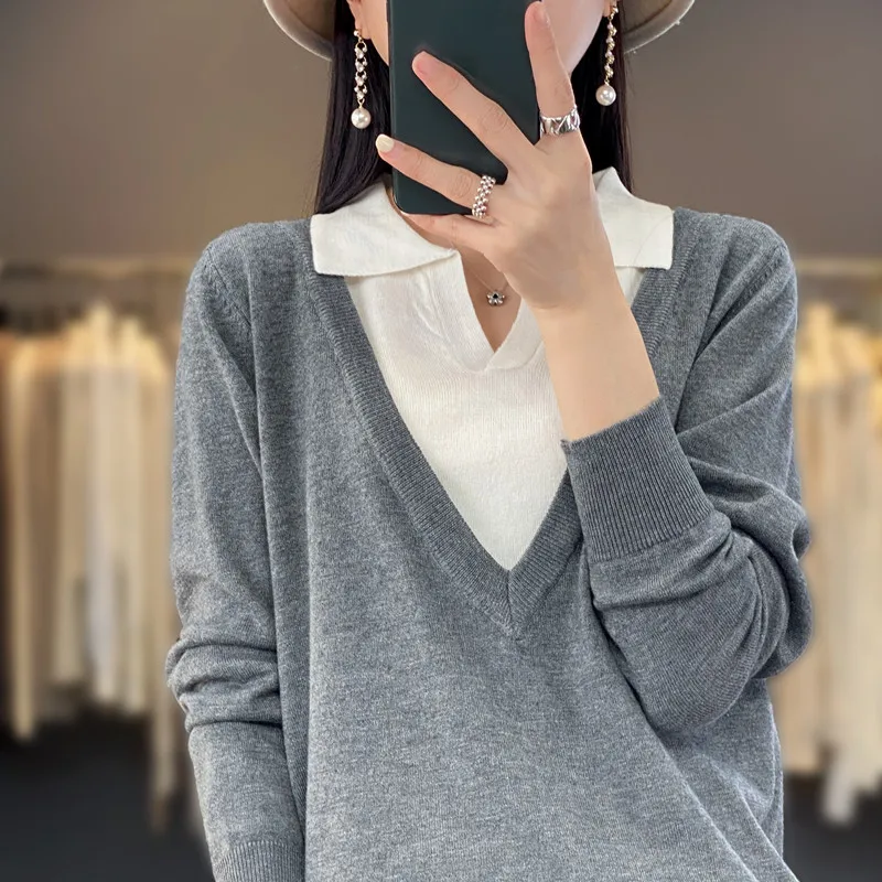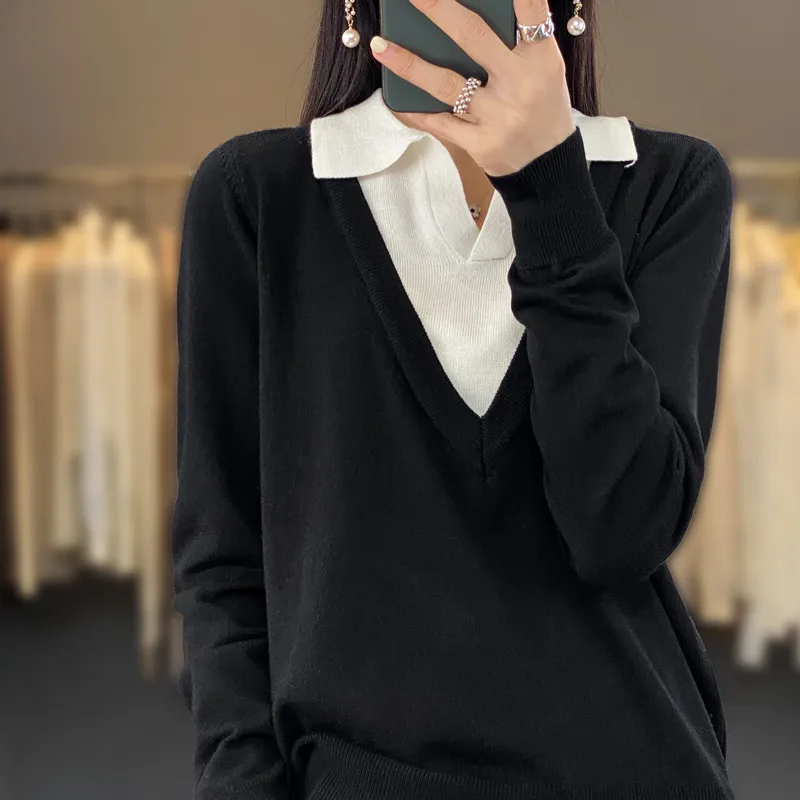 Купить Spring And Autumn Thin Fashion Color Matching Polo Collar Fake Two-Piece Sweater Women's Loose Sweater Wool Bottoming Shirt за 1150рублей