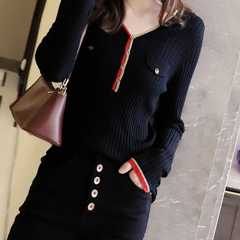 Купить Spring Autumn Women's New Contrasting Colors Pullovers Sweaters V-Neck Slim Long Sleeve Jumpers Undercoat Knitted Fashion Casual за 950рублей