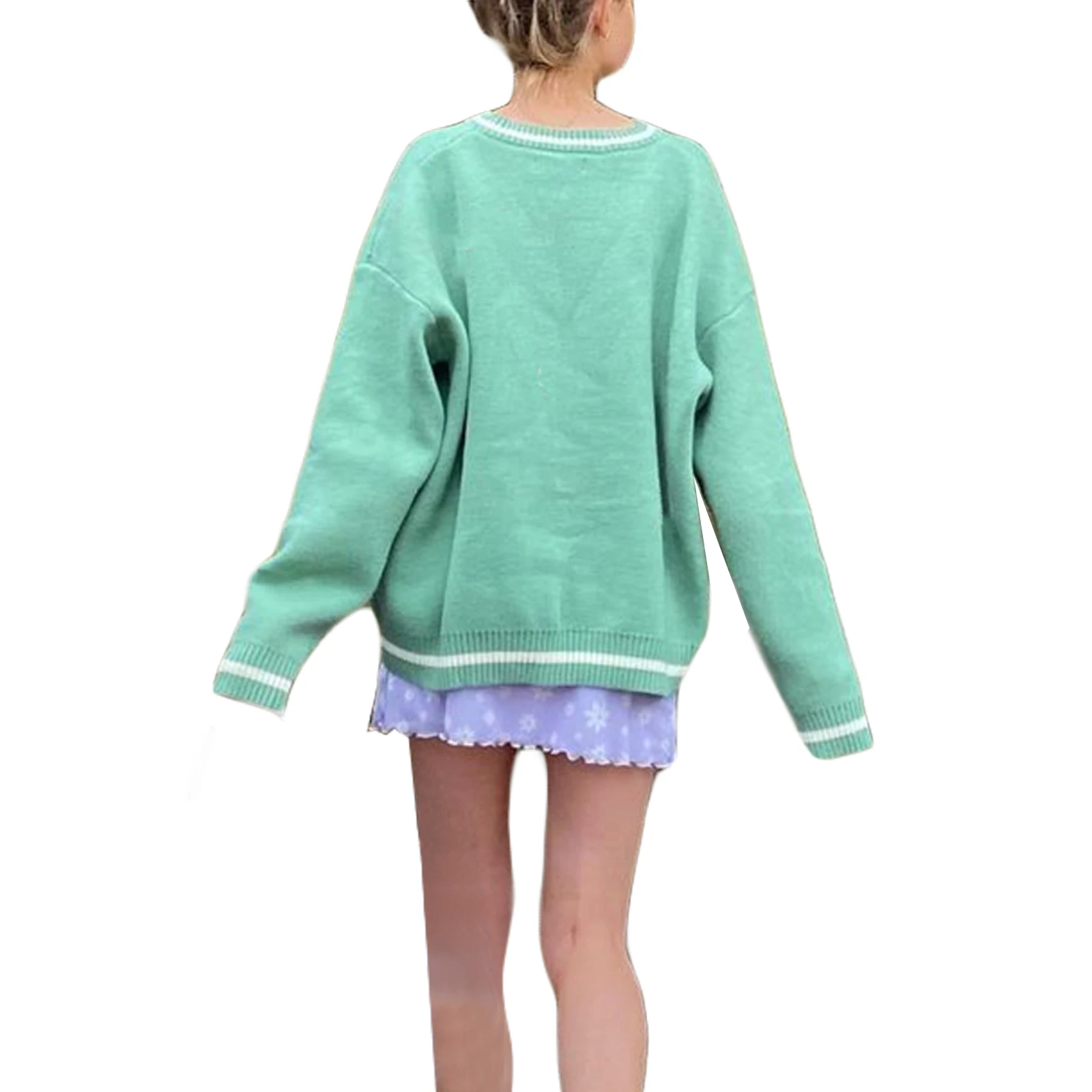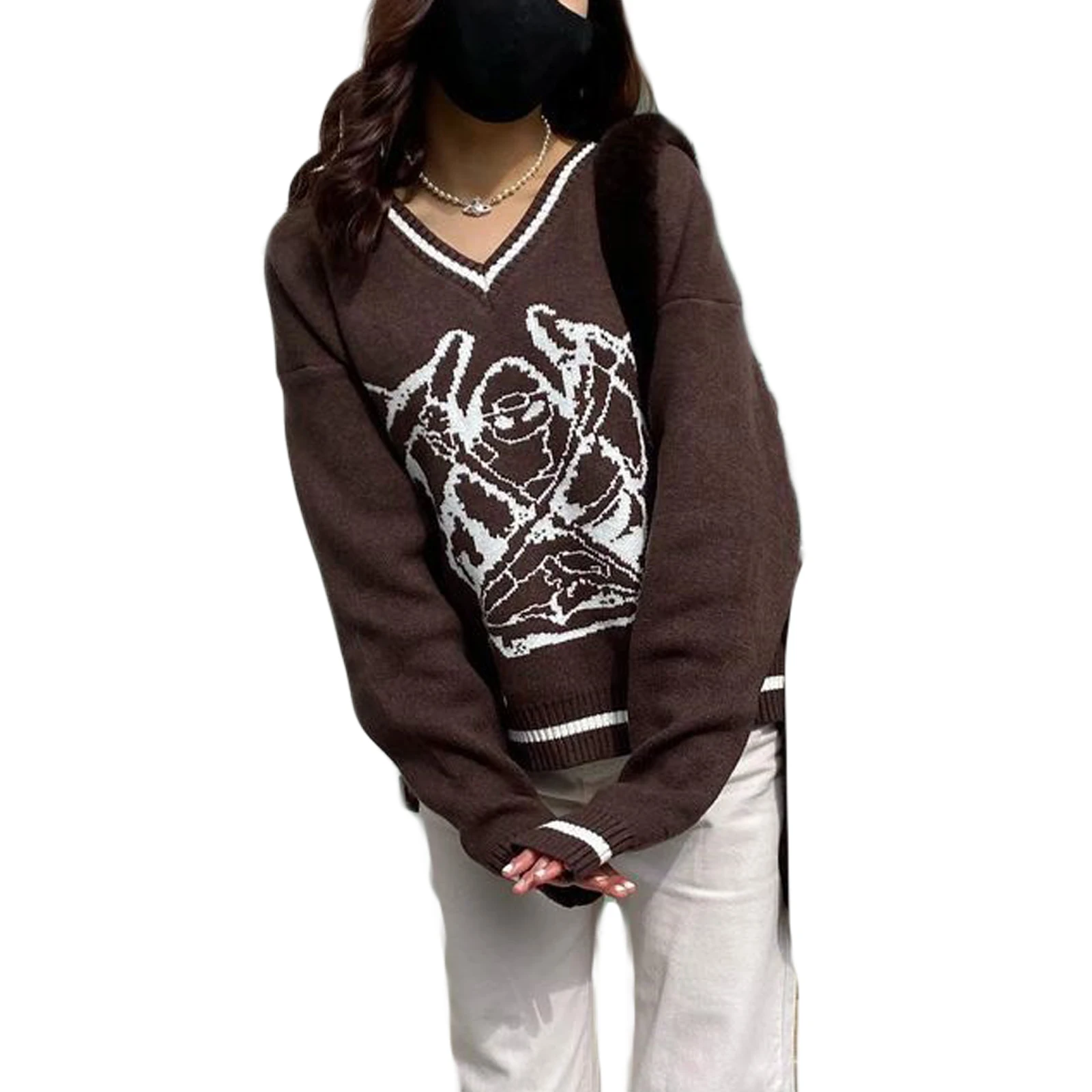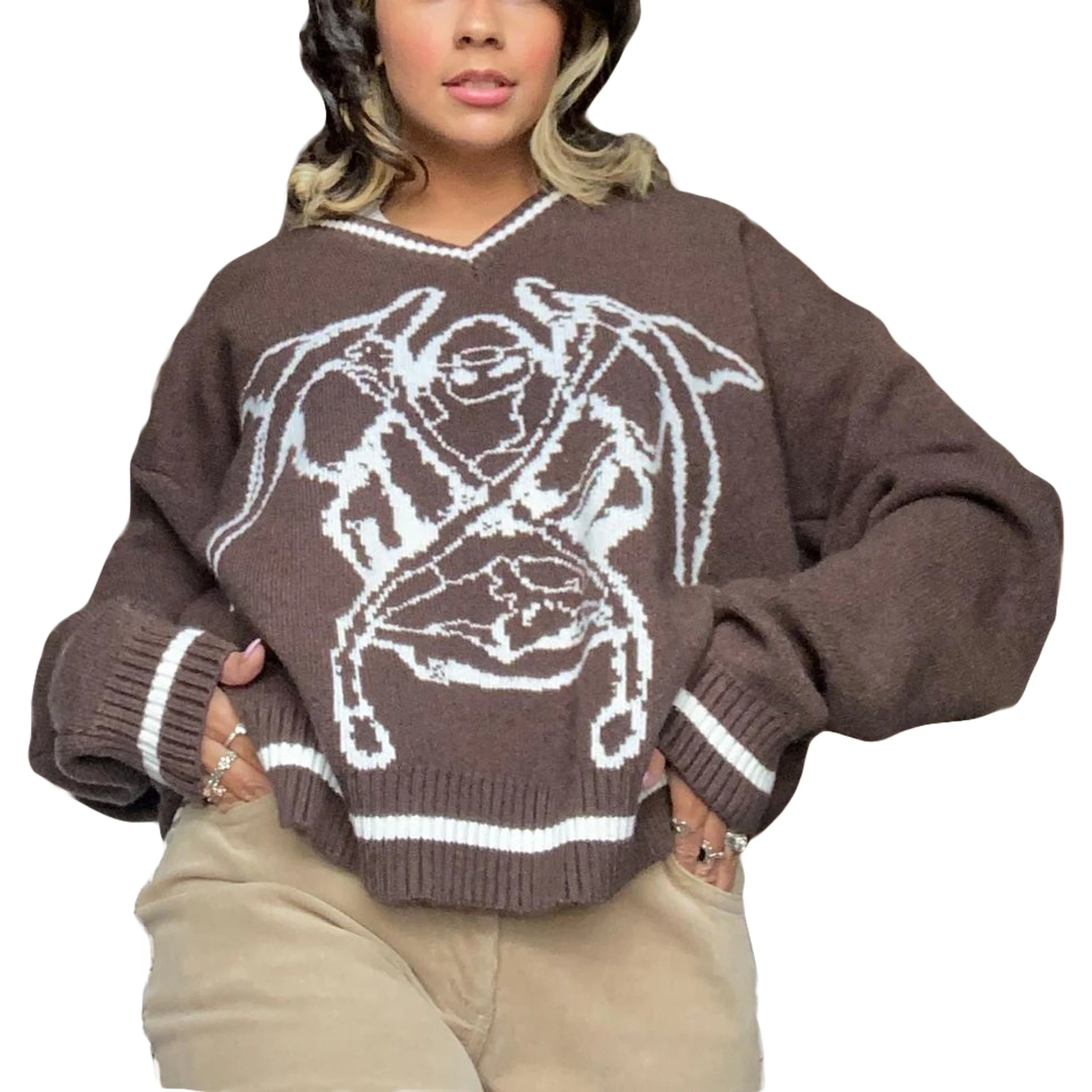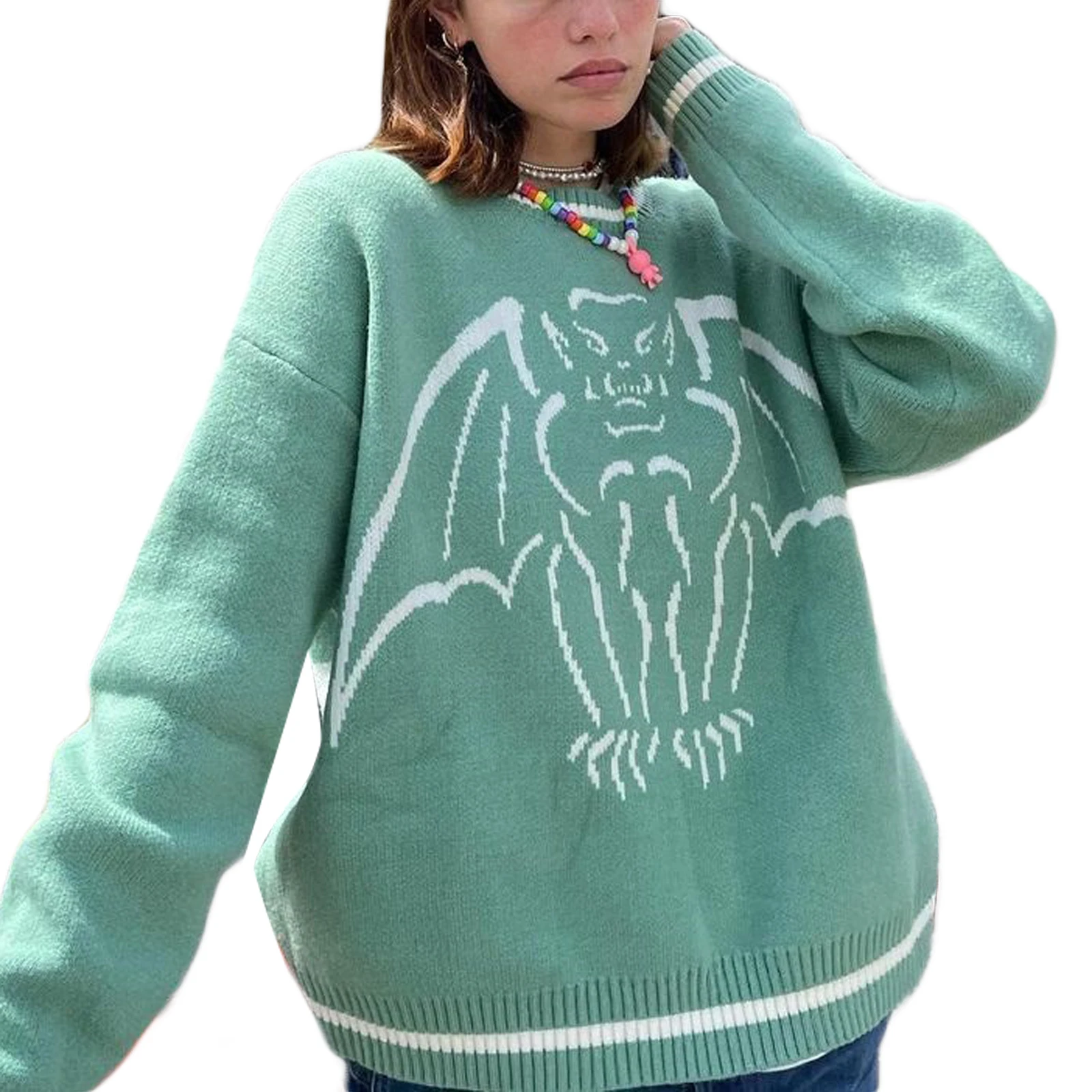 Купить Spring Fall Women's Round Neck Sweaters Long Sleeve Animal Monster Print Casual Loose Fit Knit Tops Green/ Brown за 550рублей