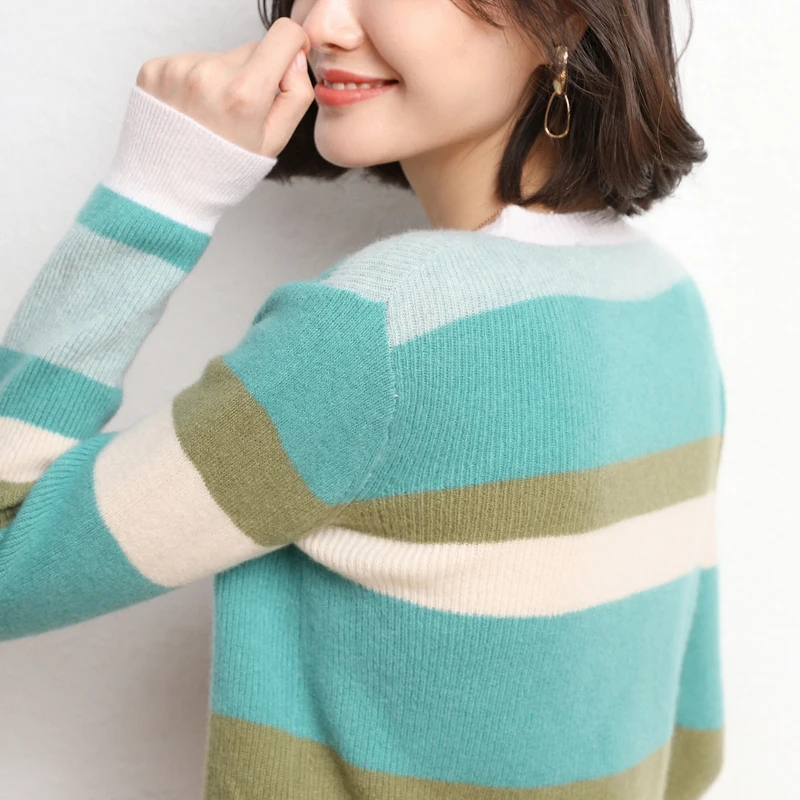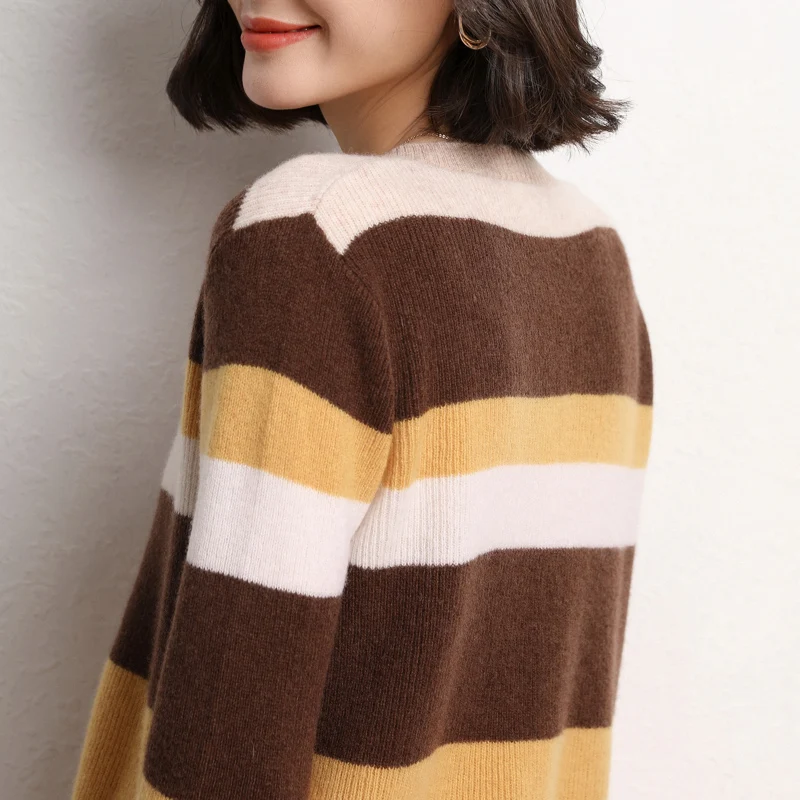 Купить Spring and Autumn Contrast Stripes Long Sleeve Wool Cardigan Women's Short Coat Sweater Color Matching Round Neck Slim Joker Top за 1050рублей