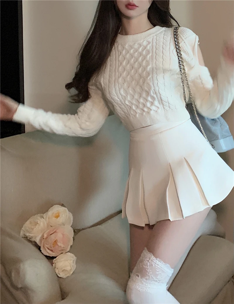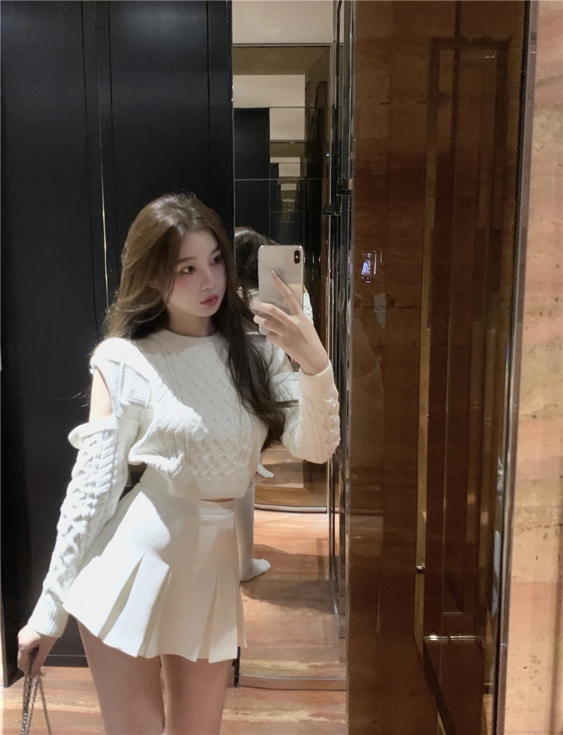 Купить Spring and Autumn Women New White Short Sweater Korea Design Cold Shoulder Loose Long Sleeve Pullovers Tops за 800рублей