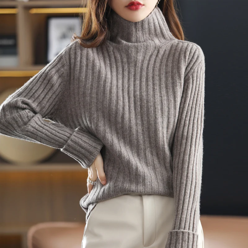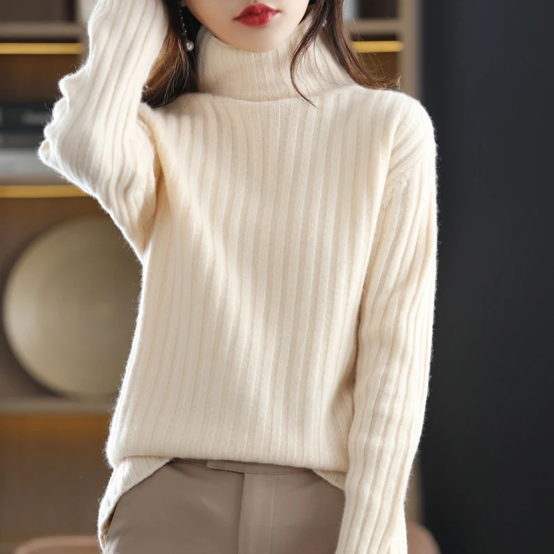 Купить Striped High Neck Wool Sweater Elegant Loose Cashmere Knit Sweater Women's Basic Paragraph Large Size Warm Pullover SweaterS-XXL за 1600рублей