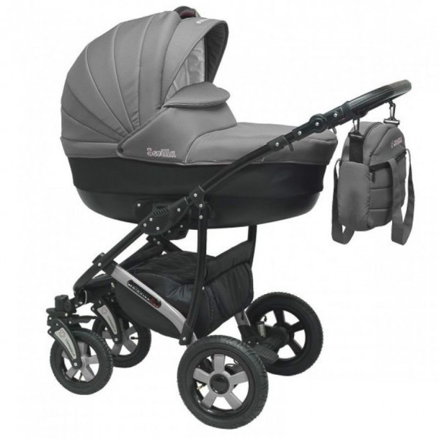 Дизайн коляски стильный и привлекательный, исполнен в сочетании серого и черного цвета
