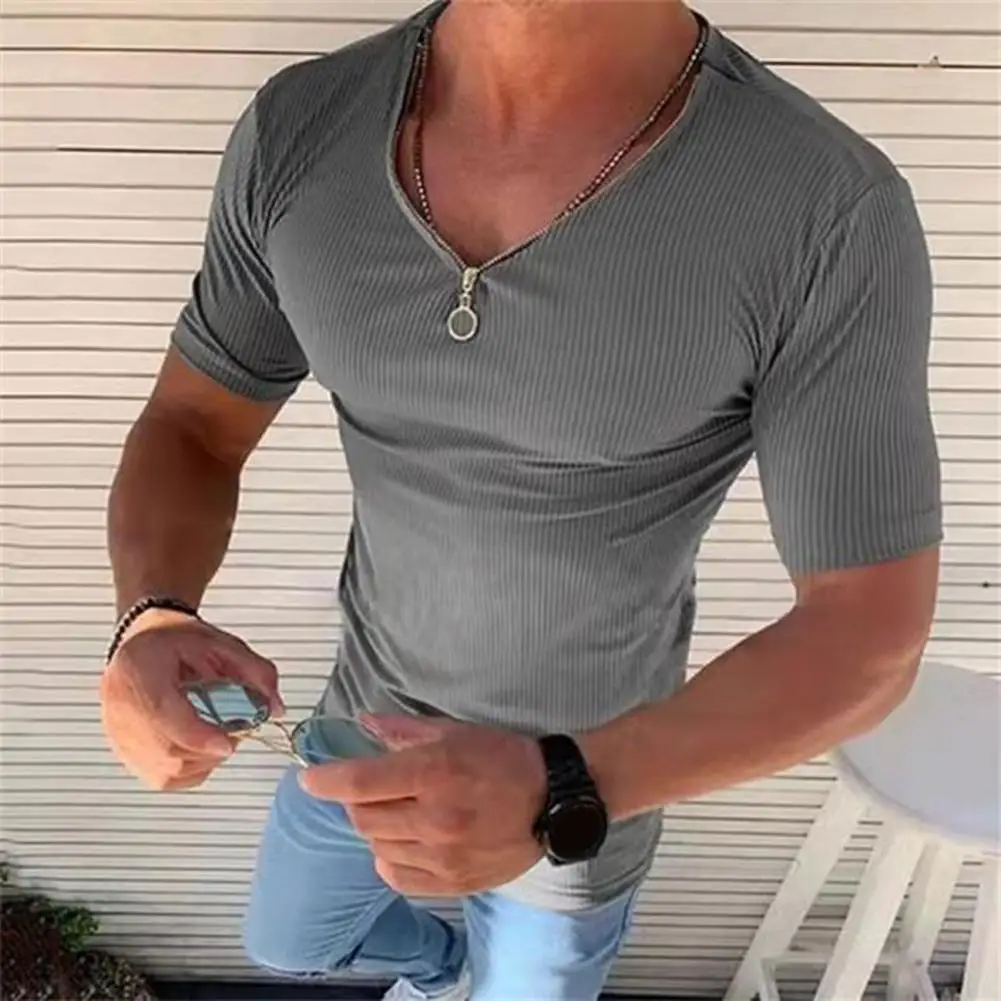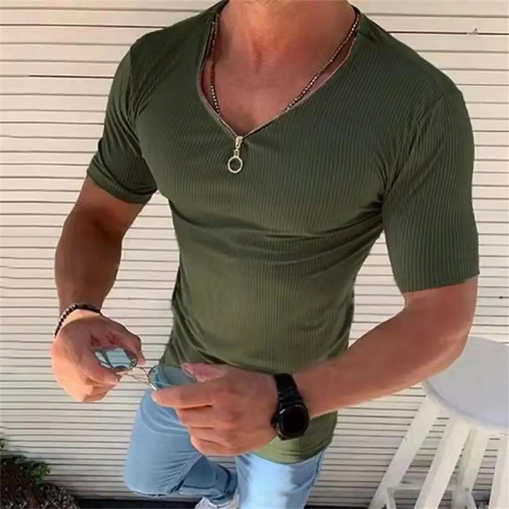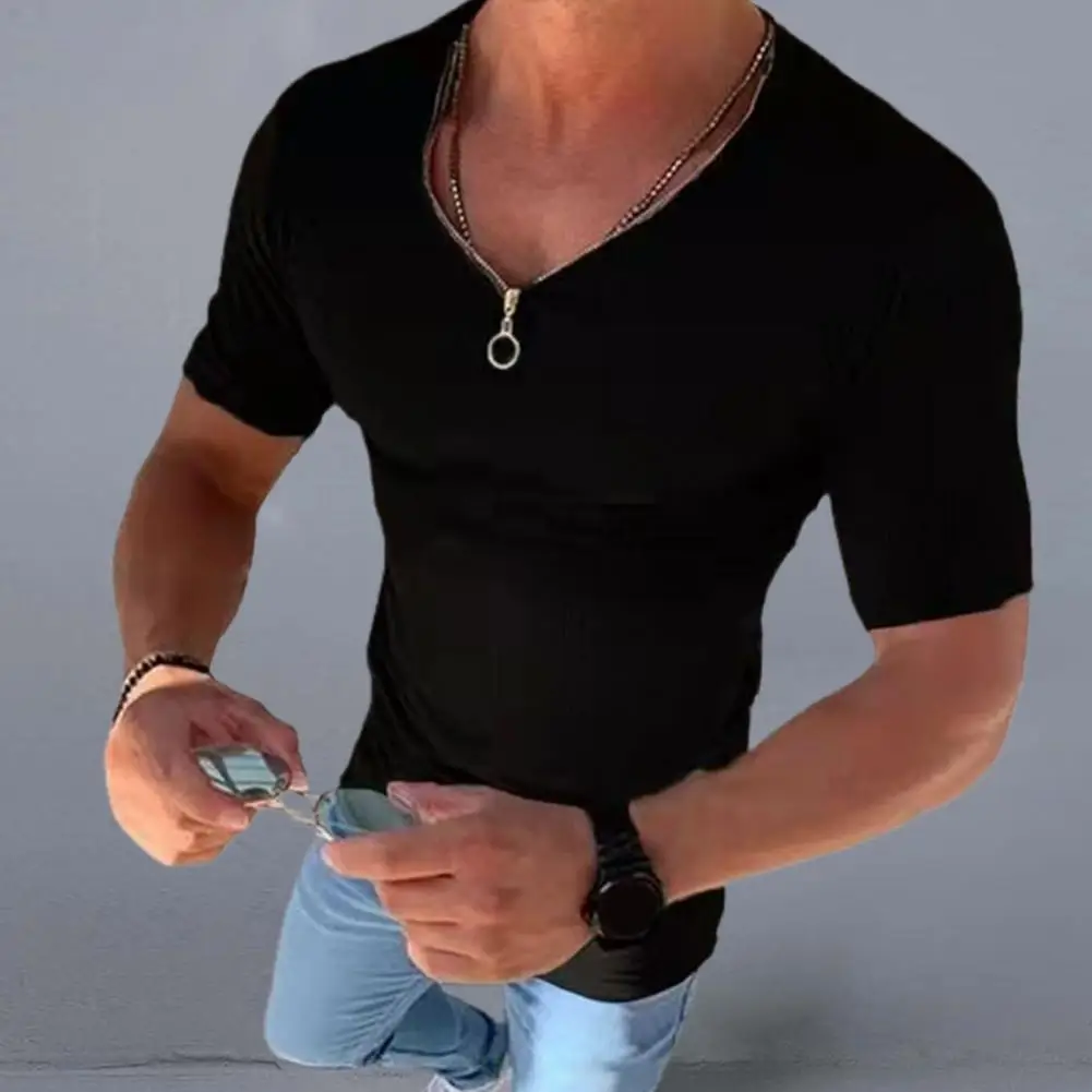 Купить T Shirt Men Zipper V Neck Short Sleeve Tshirts Summer Mens Clothing Streetwear Casual Slim Fit Solid Color T-shirt Tops за 250рублей