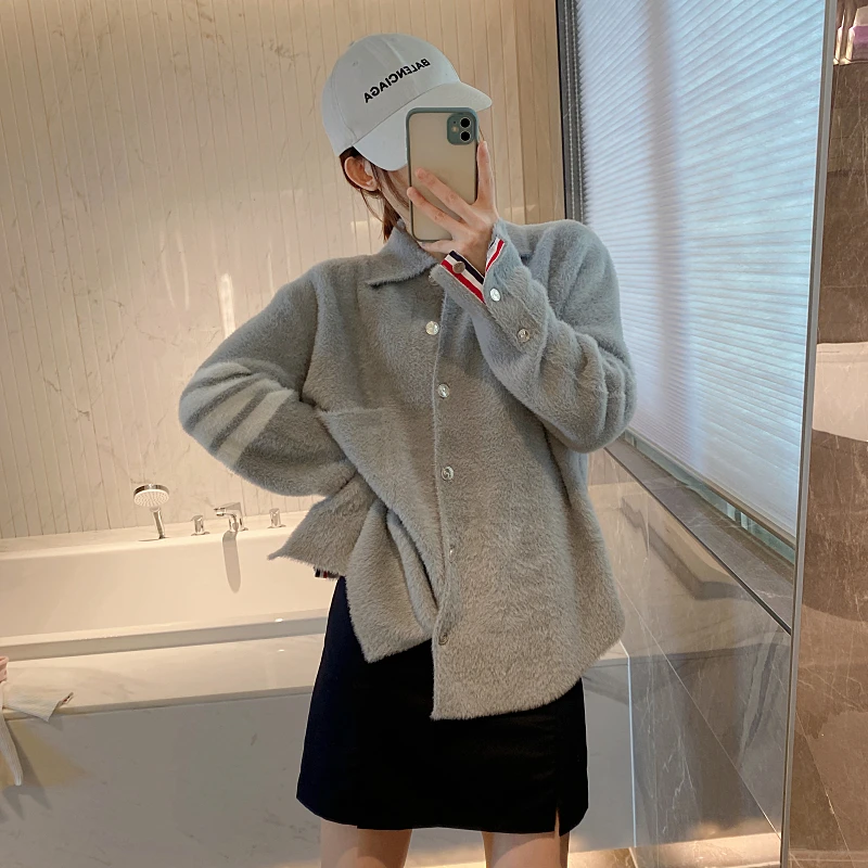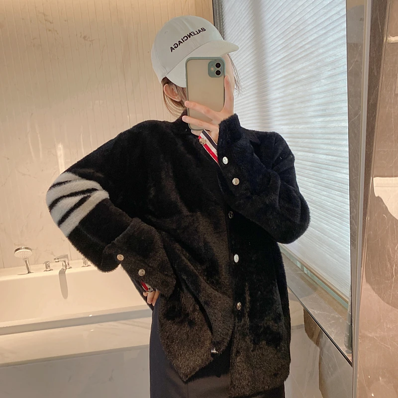 Купить TB Four Bar Gold Button Imitation Mink Wool Knitted Cardigan for Women Thom Thickened Loose Shirt Style Jacket Fashion за 2400рублей