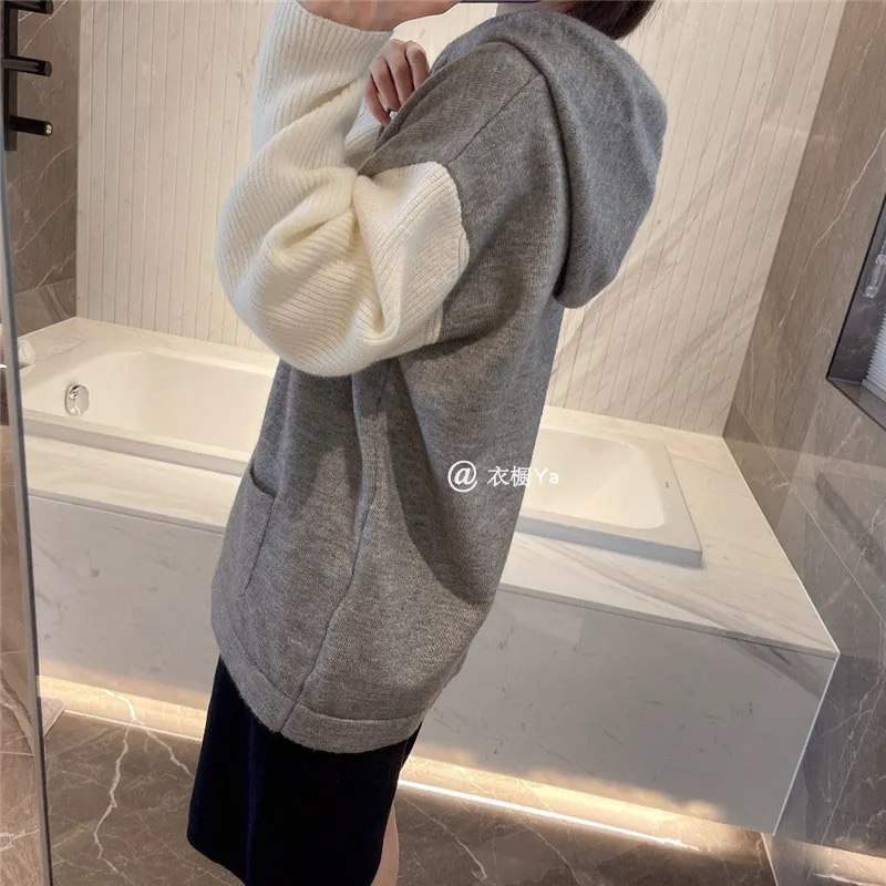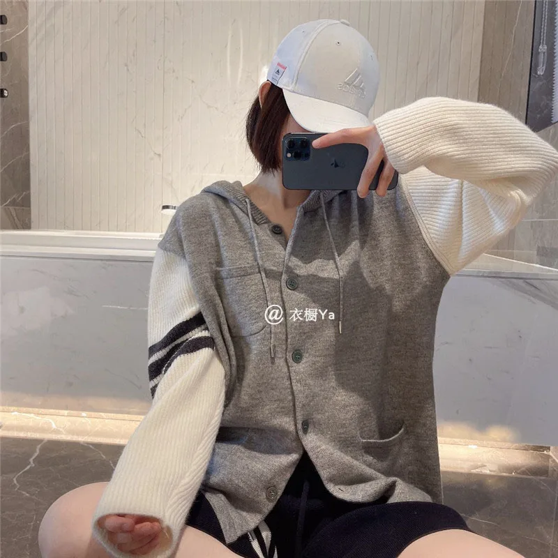 Купить Tb College Style Stitching Knitted Jacket Spring Wool Hooded Sweater Lazy Age-reducing Sweater Cardigan All-match Women за 2350рублей
