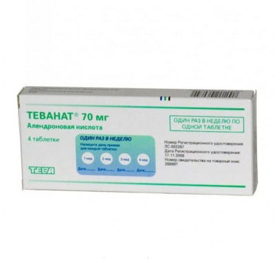 Препарат Теванат назначают внутрь по 1 таб . 10 мг 1 раз/сут или по 1 таб . 70 мг 1 раз в неделю . Таблетку принимают целиком, запивая стаканом воды не менее чем за 30 мин до первого приема пищи . . .