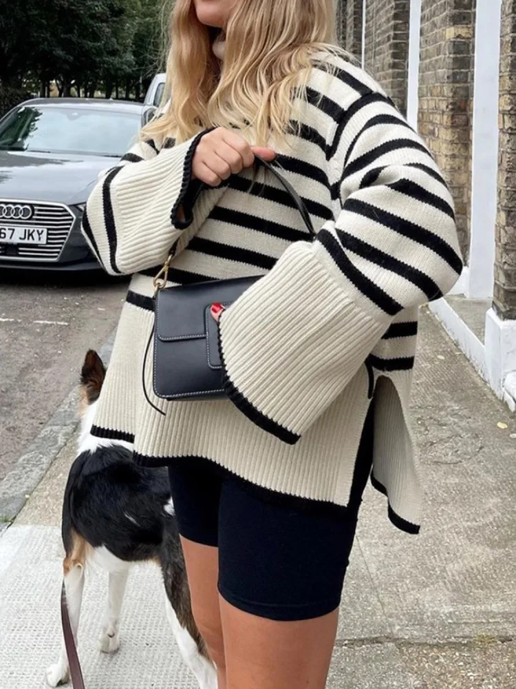 Купить Tossy Winter Women’s Long Sleeves Knit Sweater Turtleneck Striped Print Loose Pullover Tops 2022 New Autumn Oversized Sweater за 1050рублей