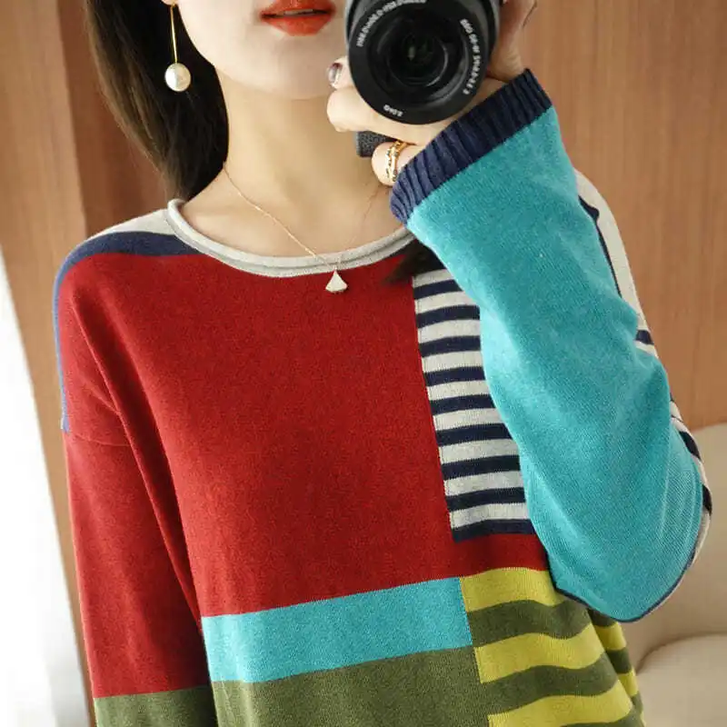 Купить Vintage Striped Patchwork Knitted Sweaters Women's Clothing Spring Autumn Stylish Contrasting Colors Korean Loose O-Neck Jumpers за 1000рублей