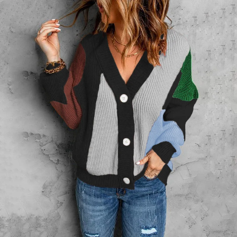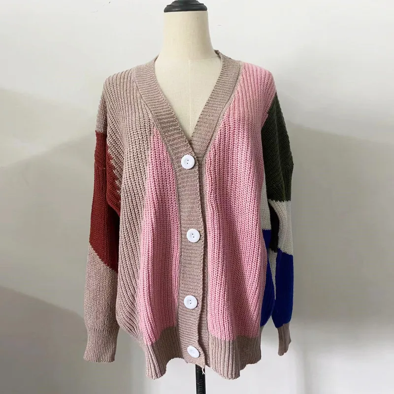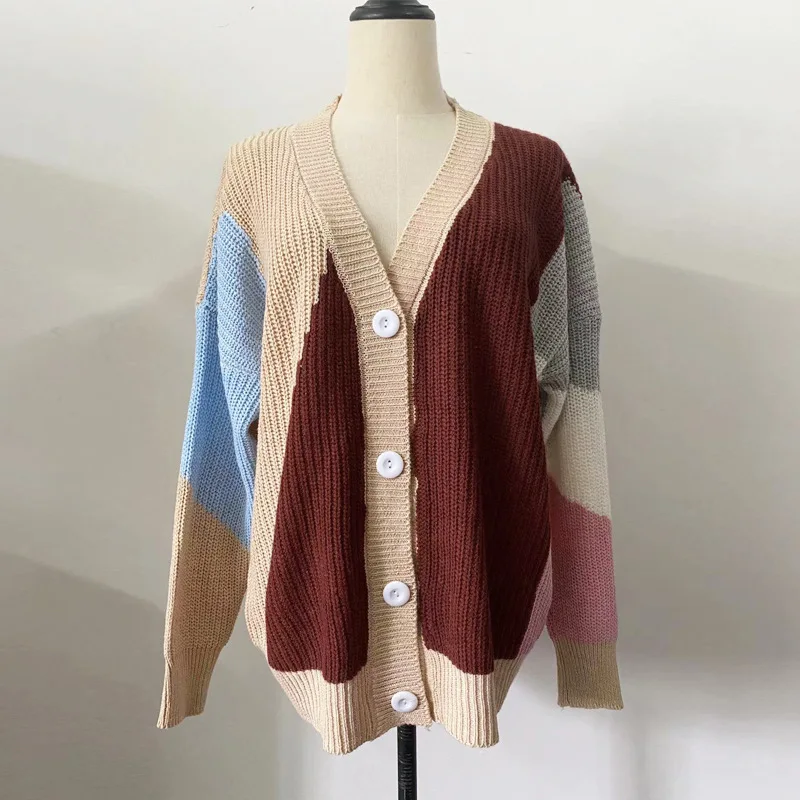 Купить Vintage Women V-neck Button Color Contrast Cardigan Sweater Coat 2022 Spring Autumn Long Sleeve Loose Jackets Casual Knit Top за 400рублей