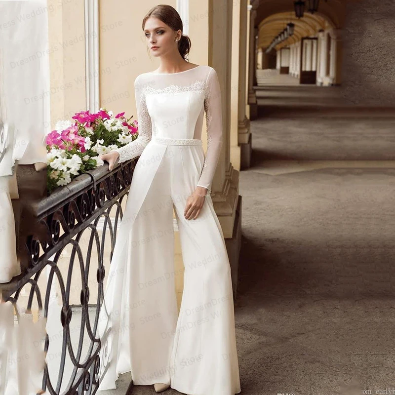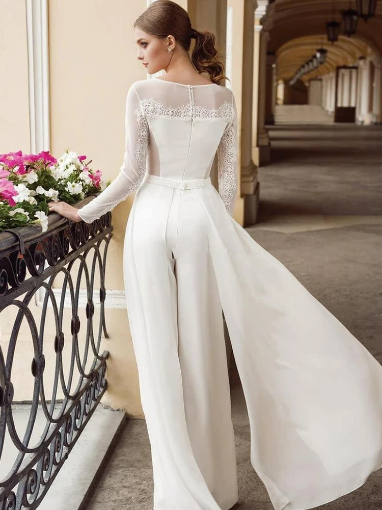 Купить Wedding Dress Jumpsuit Bohemian Jumpsuit Lace Jewel Neck Long Sleeves Beach Bridal Gowns Floor Length Chiffon Cheap Elegant за 4150рублей