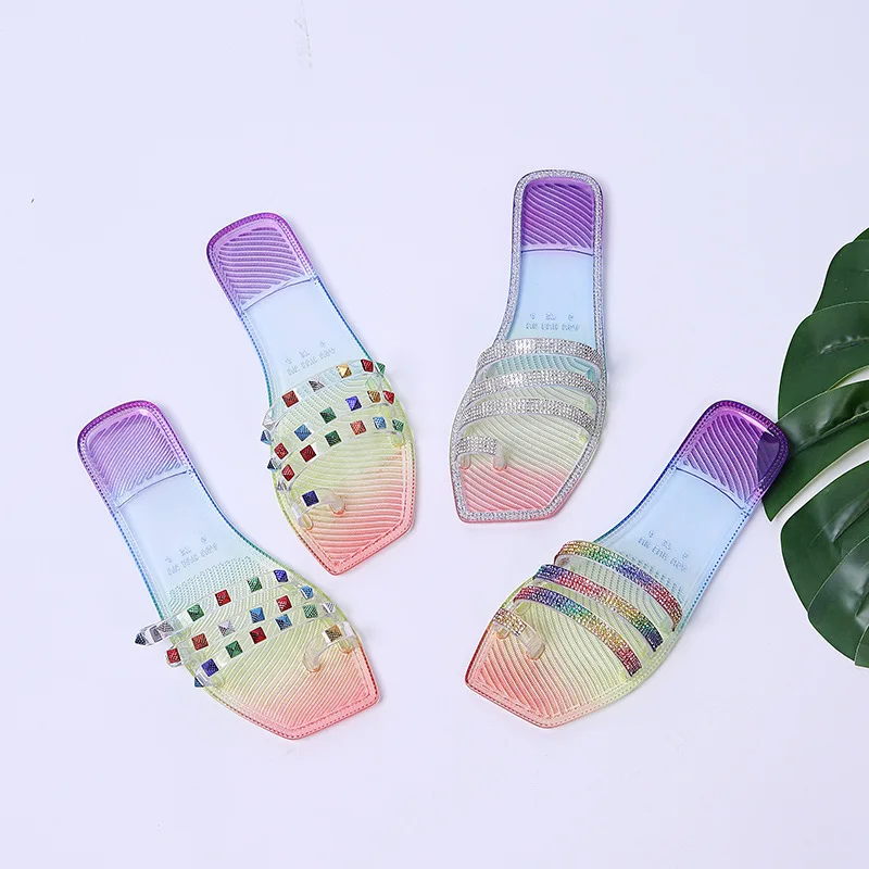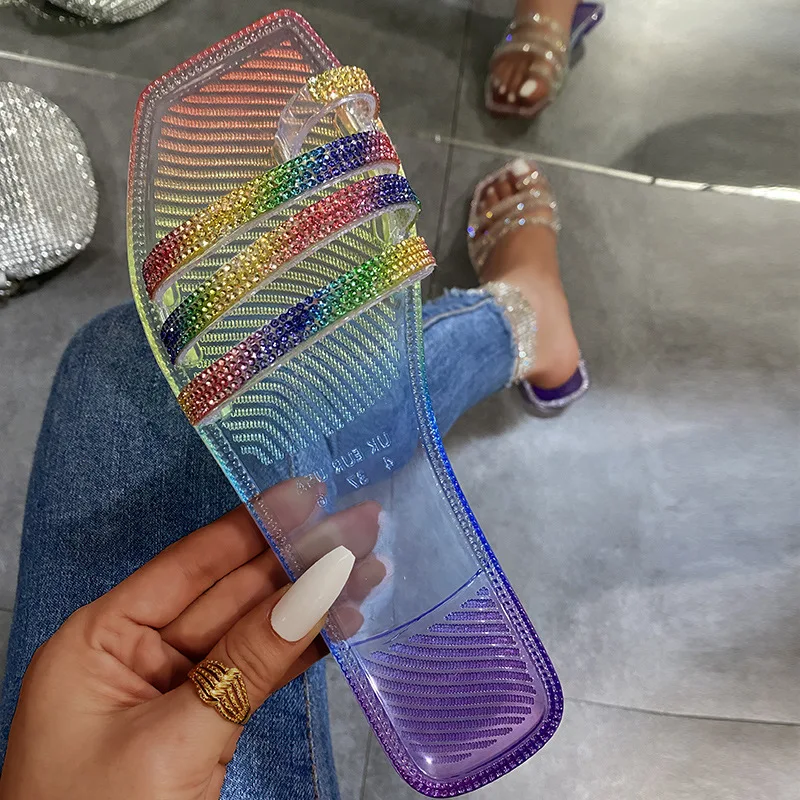 Купить Woman Rhinestone Flat Sandalias Beach set toe one word outer wear Flip Flops Slip Slides Transparent Colorful Crystal Slippers за 750рублей