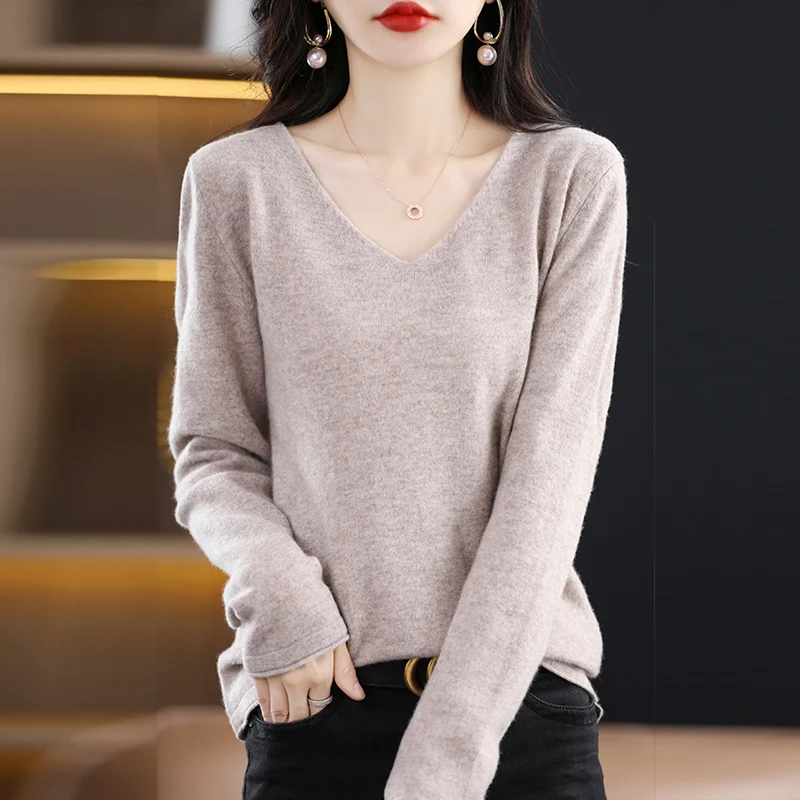 Купить Women's Elegant V-neck Woolen Sweater Spring Autumn New Loose Long Sleeve Pullover Solid Color Simple Versatile Basic Undercoat за 3550рублей