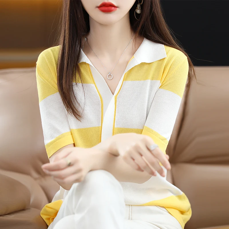 Купить Women's Sweater 2022 Summer Style Korean Version Simple Niche Allmatch Loose Striped Thin Section Delicate Knitted Short Sleeves за 1250рублей