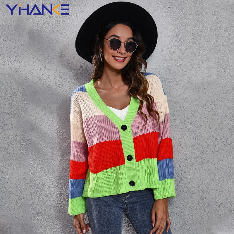 Купить Women's Sweater Contrasting Color Stripes Stitching Loose Knit Cardigan Sweater Women Short Coat Woman Y2k Pink Cardigan за 1200рублей