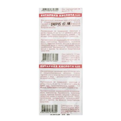 Янтарная кислота 100 мг, 20 таблеток . 1,01€ . Добавить в избранное . Добавлено в избранное . Янтарная кислота 100 мг, 20 таблеток . Пищевая добавка . Источник янтарной кислоты . Подробнее о продукте . Биологически активная добавка .