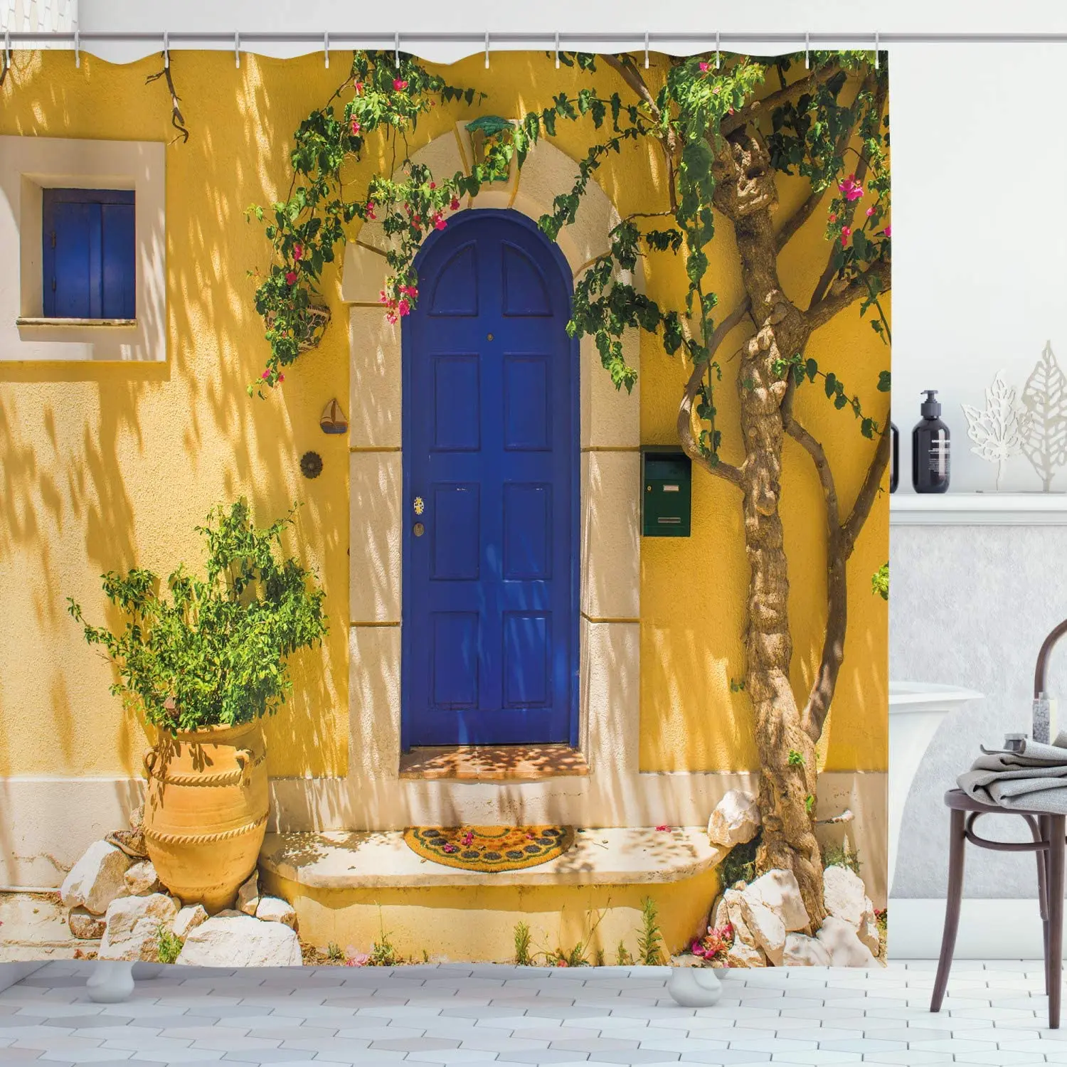 Купить Yellow and Blue Shower Curtain, Traditional Greek House Door with Flowers and Tree Mediterranean Scenery, Cloth Fabric за 550рублей