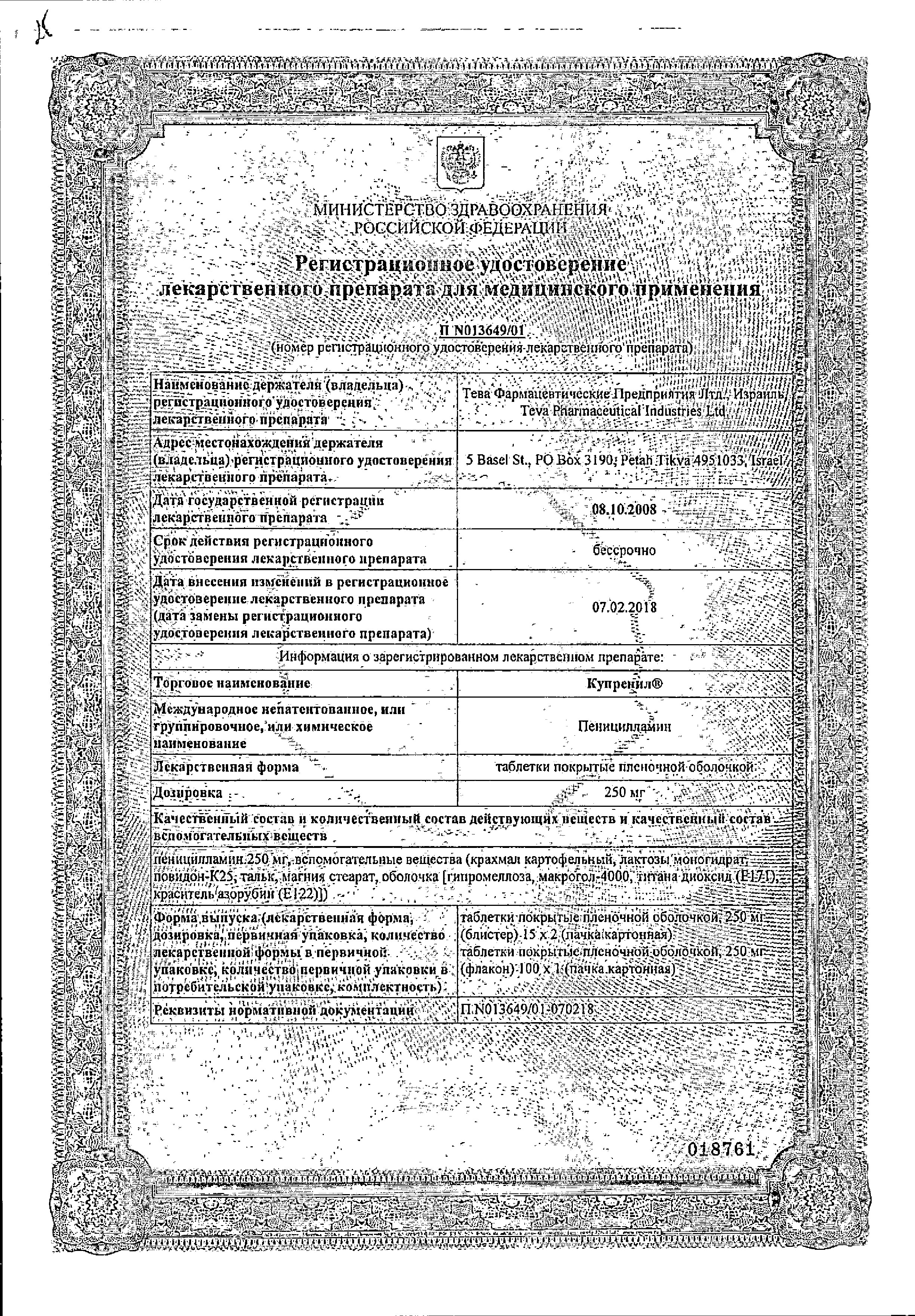 Упаковки препарата Купренил — дозировка, форма выпуска, описание лекформы, штрихкод, номер РУ