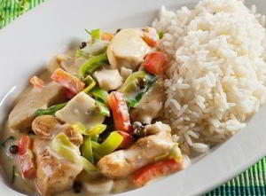 Курица с рисом — тушеные с карри, овощами и изюмом кусочки курицы . Блюдо готовится быстро и просто, отлично подходит для сытного обеди или ужина .