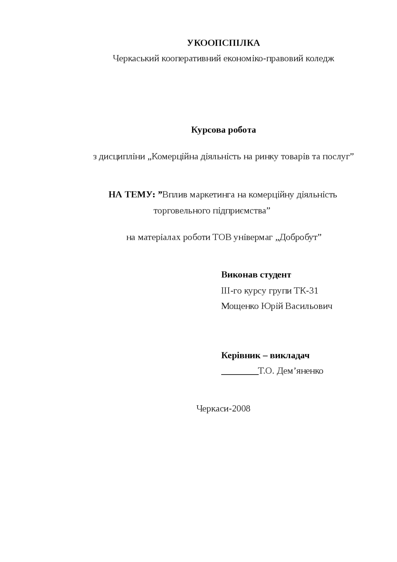 УКООПСПІЛКА Черкаський кооперативний економіко-правовий коледж Курсова робота з дисципліни „Комерційна діяльність на ринку товарів та послуг" НА ТЕМУ: "Вплив маркетинга на комерційну діяльність торговельного . . .