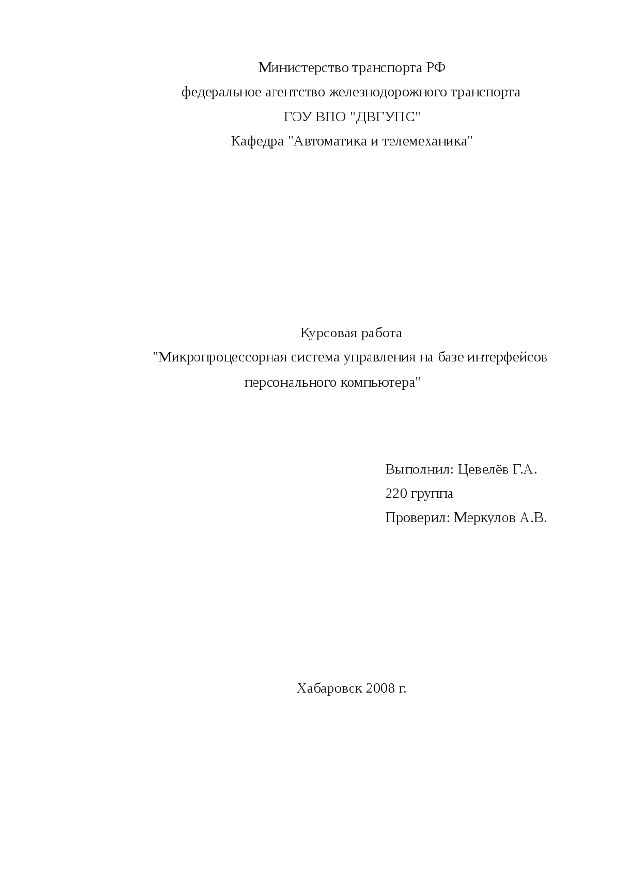 Курсовая работа (т) по теме Микропроцессорная система управления объектом Предмет: Информатика, ВТ, телекоммуникации