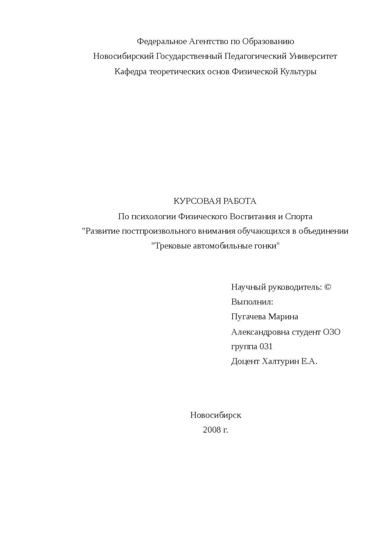 "Развитие постпроизвольного внимания обучающихся в объединении . " Трековые автомобильные гонки " Научный руководитель: © Выполнил: Пугачева Марина Александровна студент ОЗО группа 031 . Доцент Халтурин Е .А . Новосибирск . 2008 г . СОДЕРЖАНИЕ Введение .