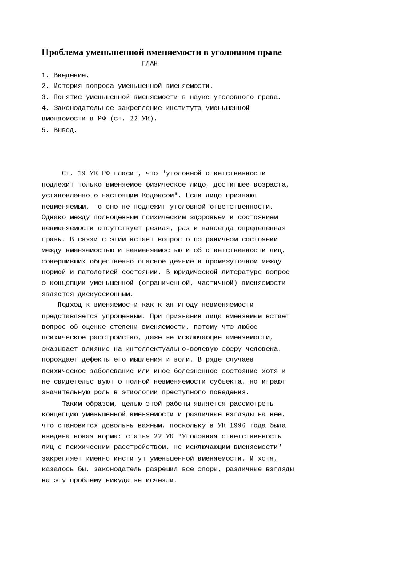 Цель курсовой работы: установить особенности одного из важнейших институтов уголовного права - состояния вменяемости, невменяемости и уменьшенной вменяемости лиц, совершивших преступление . Задачи курсовой работы: 1) рассмотреть исторические аспекты становления . . .