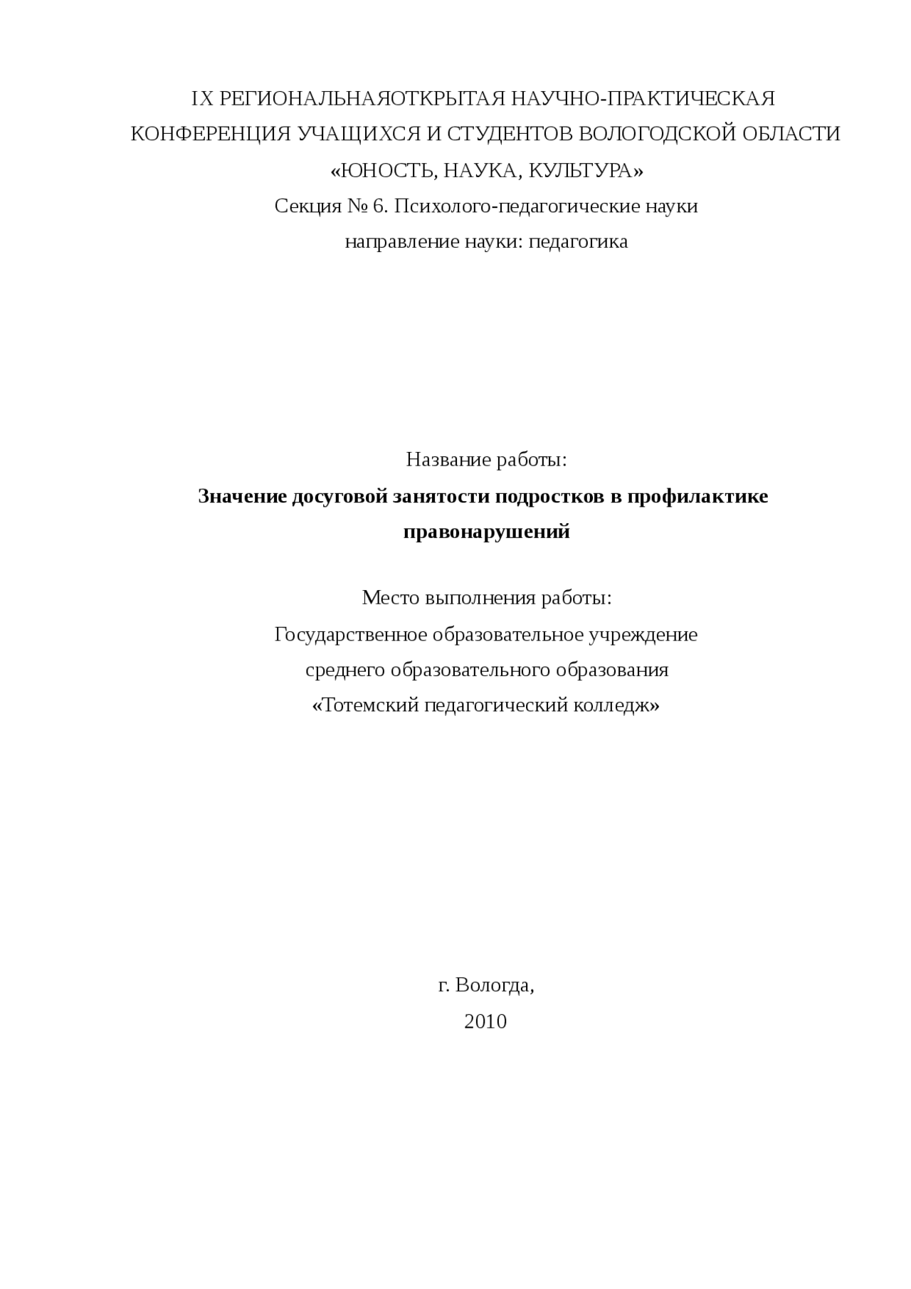 Скачать: Значение досуговой занятости подростков в профилактике правонарушений . Курсовая работа (т) . 2010-10-24 . Тут можно посмотреть и скачать …