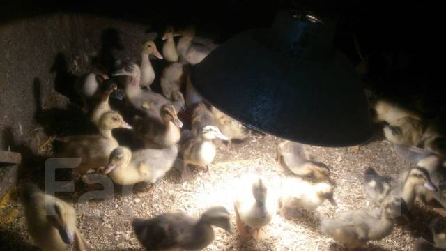Gicku91 Московские утки куры едят свою пищу, фермерская концепция Gicku91 Lobachad Маленькие цыплята и утята греются на траве под лампой во дворе .