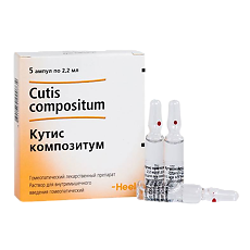 Кутис Композитум - раствор для внутримышечного введения гомеопатический . По 2,2 мл в ампулы из бесцветного стекла гидролитического класса 1 . На каждую ампулу нанесены насечка и цветная точка .