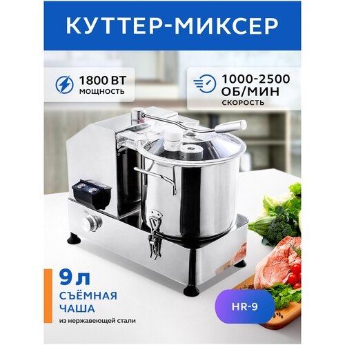 Gastrorag HR-9 masaüstü kesici-mikser, gıda ürünlerini doğramak ve karıştırmak için kullanılan profesyonel bir mutfak cihazıdır. Onun yardımıyla çeşitli kıvamlarda kıyma, kalın soslar, sebze ve meyve püreleri, hamur yoğurma, fındık kırma, galeta unu ve otlar hazırlayabilirsiniz. Et karıştırıcısı tamamen paslanmaz çelikten yapılmıştır ve 9 litrelik bir kase, şeffaf bir kapak ve tırtıklı bileme özelliğine sahip S şeklinde bir bıçakla donatılmıştır. Masa üstü et ve sebze doğrayıcı, 1100 ila 2800 rpm aralığında yumuşak bir hız kontrol fonksiyonuna sahiptir. Kesicinin tasarımı güvenli çalışmayı ve uzun servis ömrünü garanti eder. Güvenlik özellikleri: kase kilidi, mikro anahtarlı kapak kelepçe kolu, aşırı ısınma koruması (motor sıcaklığı 115°C'ye ulaşırsa doğrayıcı otomatik olarak kapanacaktır). Sürekli çalışma süresi - 3 dakika. Herhangi bir işlemin tamamlanması genellikle 1 dakikadan fazla sürmez.Gastrorag HR-9 kesici, profesyonel bir mutfakta gıda ürünlerini doğramak ve karıştırmak için kullanılır. Model paslanmaz çelikten yapılmış olup, S şeklinde bıçaklı ve kapaklı 9 litrelik bir kaseye sahiptir. Masaüstü kesici-mikser, 1100 ila 2800 rpm aralığında yumuşak bir hız kontrol fonksiyonuna sahiptir. Cihazın sağlam tasarımı güvenli çalışmayı ve uzun servis ömrünü garanti eder. Özellikler Gövde malzemesi paslanmaz çelik Hazne malzemesi paslanmaz çelik Bıçak dönüş hızı 1100-2800 rpm