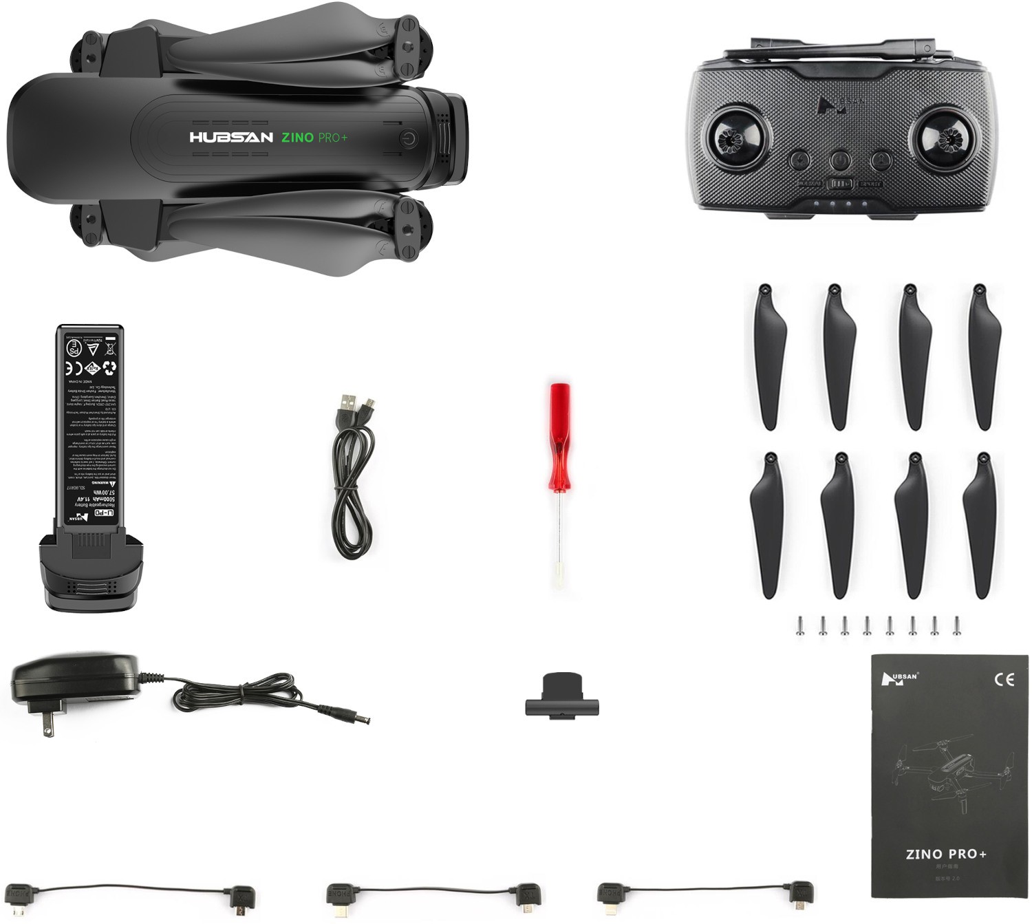 1 х Квадрокоптер HUBSAN ZINO PRO Plus 1 х Пульт управления HT016B 1 х Съемный Аккумулятор Li-Pol 5000 мАч 1 х Зарядное устройство (выходная мощность: 54Вт) 4 х Запасные лопасти (пара А и В)