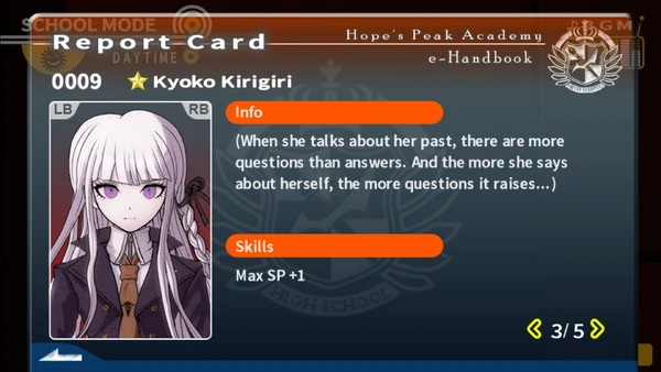 This article covers information about Kyoko Kirigiri's Free Time Events, which feature in the game Danganronpa: Trigger Happy Havoc . 1 Availability 2 Locations 3 Presents 3 .1 Present Reactions 4 Skills Granted 5 Free Time Event Dialogue & Option Guide 5 .1 Introduction 5 .2 Free Time Event 1 (Page 2) 5 .3 Free Time Event 2 (Page 3) 5 .4 Free Time Event 3 (Page 4) 5 .5 Free Time Event 4 (Page 5) 6 . . .