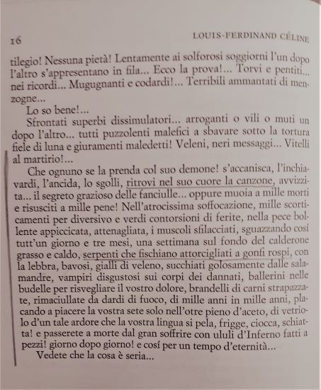 " ... Nella forgia dei fulmini di dio!... E braum! e tzzmm! e Santa Maria! l'è morta l'è morta! nel Valzerino degli Uragani! Guardate! guardate!... Il cuore che ti arriva in bocca! palpitante come un coniglio... Che è roba da vergognarsi, lo scagazzo da fifa, nel bollito di slandre da panico, in mucchi umani alla si salvi chi può!... "