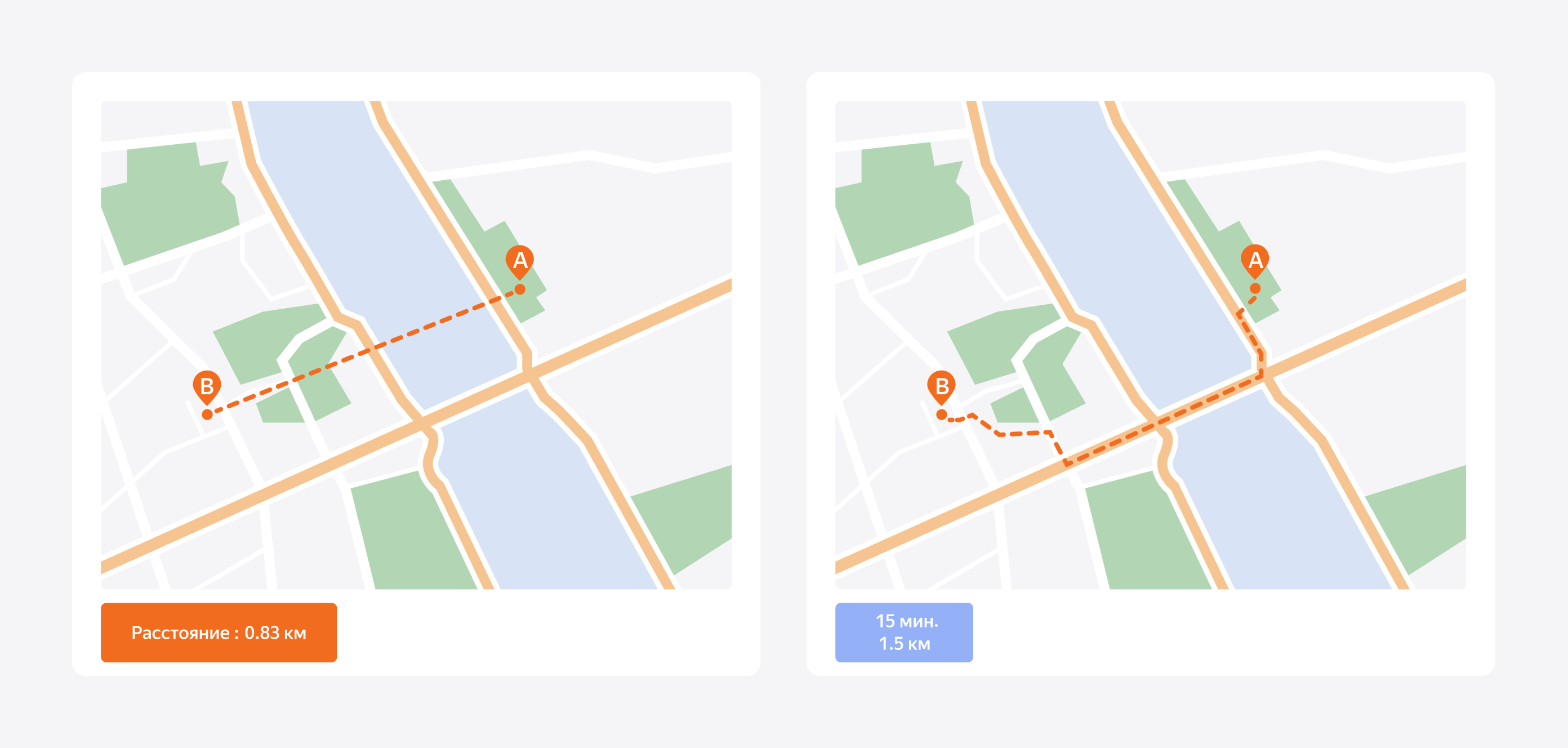 Переместимся в реальный мир. Увы, длина фактического пути от одной точки до другой не всегда равна наименьшему расстоянию. 800 метров птичьего полёта от остановки до дома превращаются в путь длиной 1.5 км из-за зданий, рек, расположения пешеходных переходов и прочего.