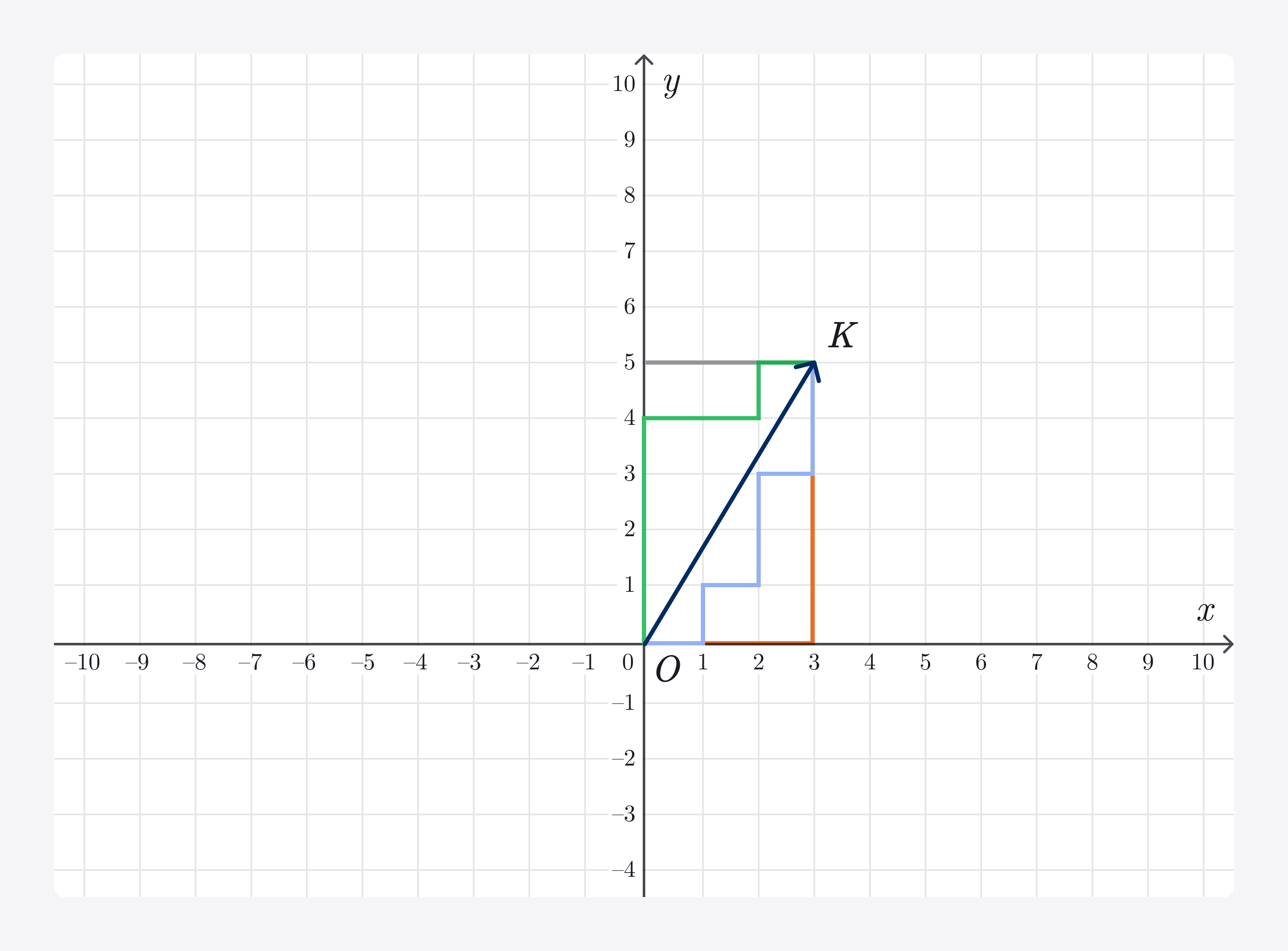 Запустим такси по нашей координатной плоскости. Каждая клетка — это один квартал. От начала координат до точки K можно «доехать» разными способами: