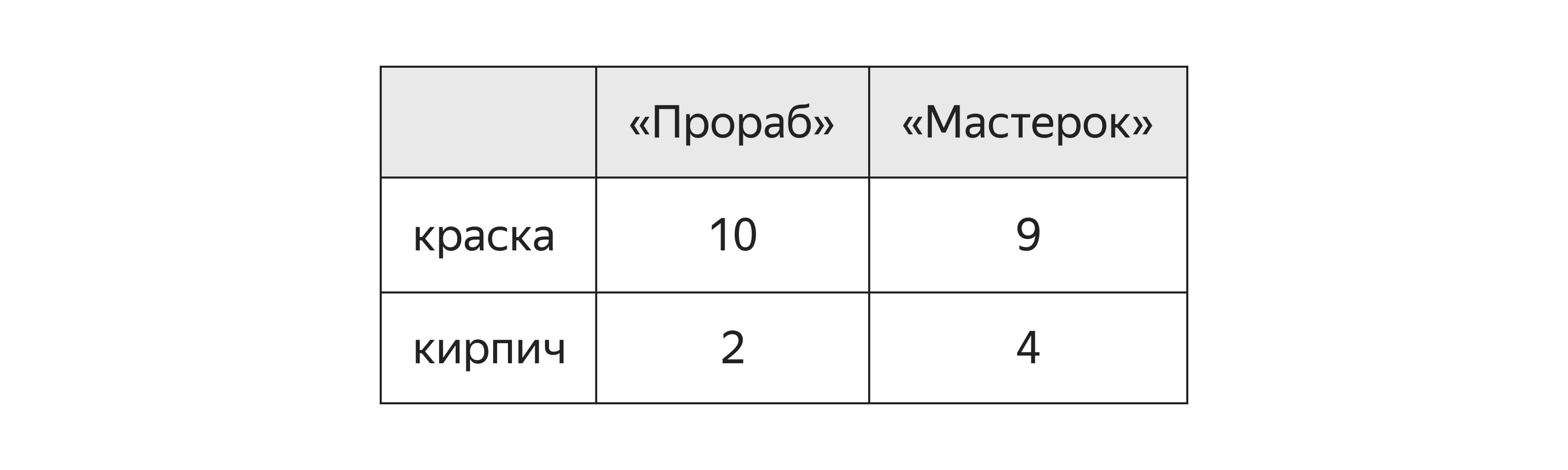 Норма L₁ для «Прораба» равна 12, а для «Мастерка» — 13. Значит, если мы планируем покупать примерно одинаково краски и кирпича, то стоит заключать контракт с «Прорабом».